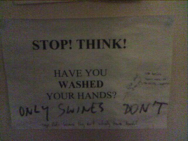 Also, because it’s funny and so you don’t have to comment on the depressing wall of drivel below, I had a strange L4D moment in the Arts block toilets seeing an A4 poster with a variety of handwritten graffiti on it: