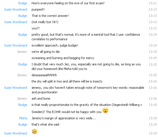 That aside, it’s been a mess of cramming, flashcards, cabin fever, overeating, chuckling at lines on this page, and mispronouncing case names til we laugh ourselves sick in fits of law student hysteria. (“Cuwwoden?” “Wiwwiams.” “Damn, that was a good move. I’ve got to… no. Fuck. Checkmate :(“) It reminds me of the adrenaline mess that was first year’s exam period, before I learned to confine the panicked pressure-rush to the schwerpunkt of the actual exam paper and got to basically relax for the entirety of third term.