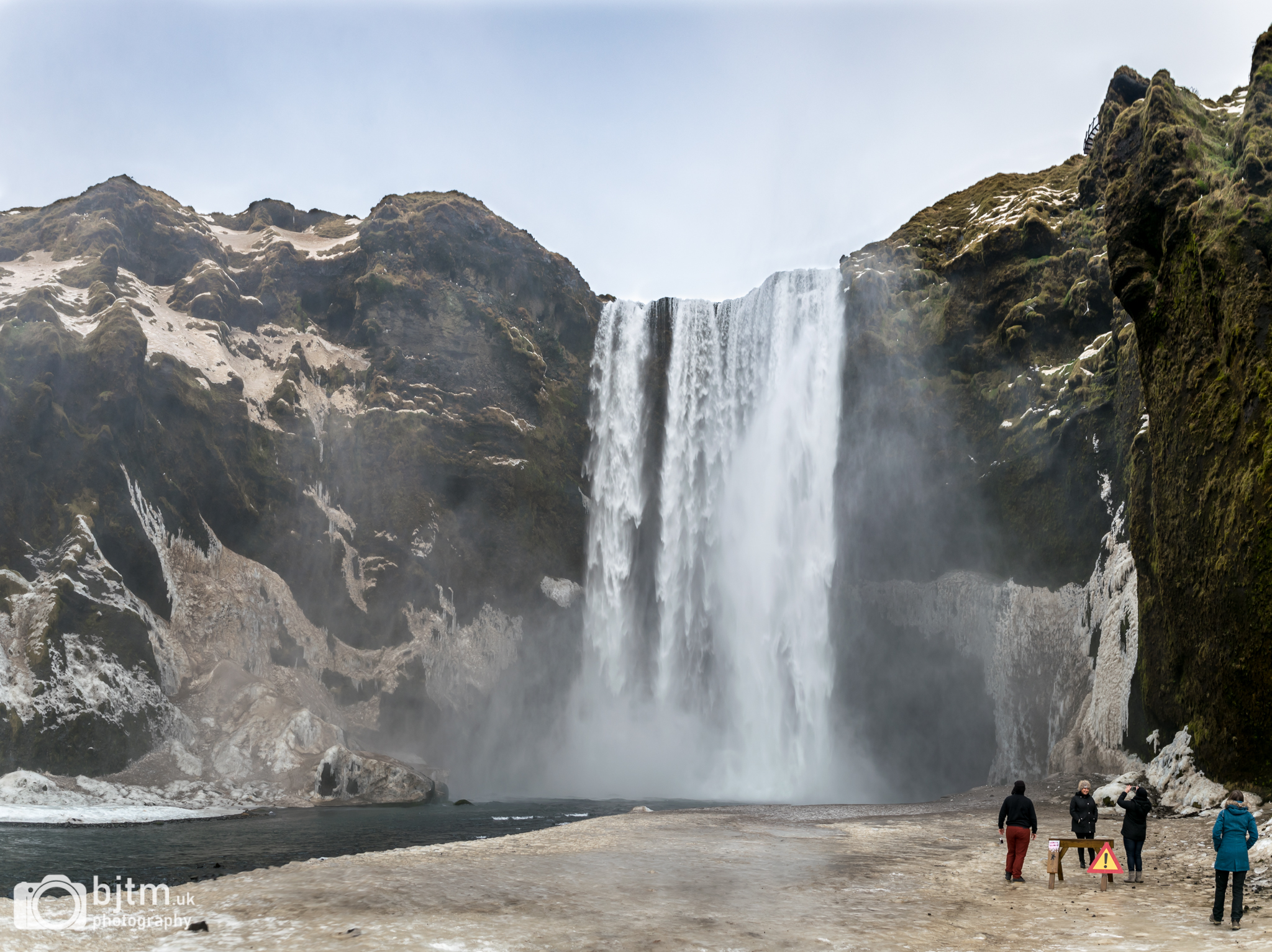 At Skógafoss, the satnav had some sort of brainfart and kept repeating the place name twice with different pronunciations. There, a great tall waterfall drops from the old sea-cliffs, drenching the tourists who trek over the ice to get closer to its base. Around its plunge pool, the overhangs are bearded with ice from fall-spray that sticks and freezes to their undersides. Drones soared high above the waterfall, the honesty-box toilets and the signs saying NO DRONES in several languages. Even at high noon, the sun could barely bring itself to creep much above the horizon.