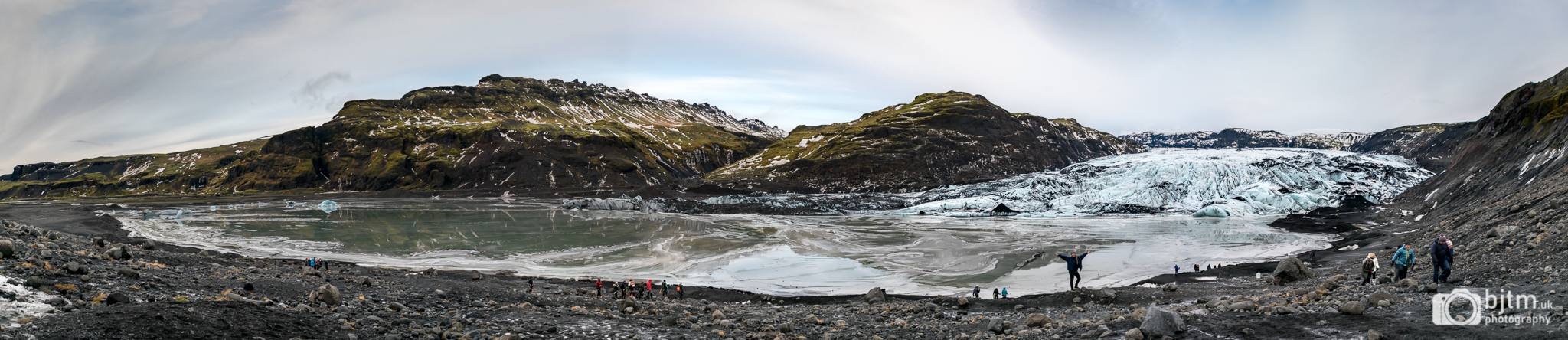 We came to the base of Sólheimajökull, the southernmost glacier in Iceland, a tongue reaching down from the huge Mýrdalsjökull ice cap (yes, I’m pasting all these names). The glacier was immense, silently threatening: a towering head of cold blue marble, filthy with black sand, feeding into a many-times-frozen cappuccino swirl of grey and black ice strata. Down by the rumpled shore, among the drumlins, sheets of ice had been shoved up into a jagged foot-high wall. Some had melted there, leaving a dry, crumbly fault line of muck.