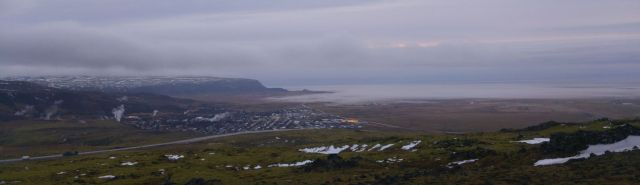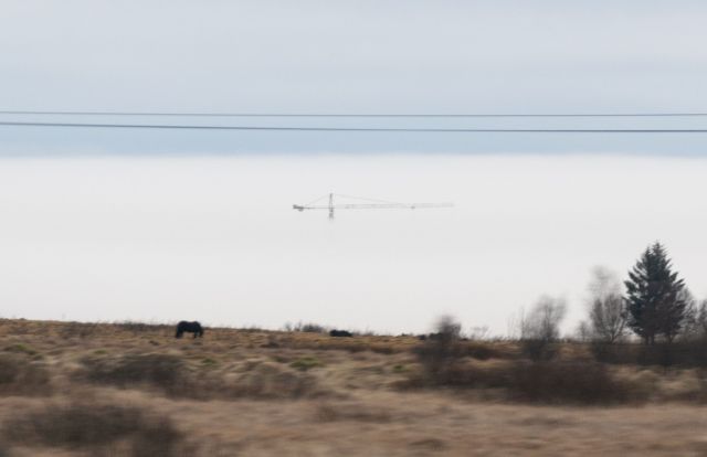 Our first really stunning vista came at an icebound viewpoint overlooking Hveragerði: painted houses and orange-lit polytunnels, trickles of steam coming from the town and the black cliffs above it, a vast haze creeping across the flat plains to the south. Then we were down among it all, and the cliffs that loomed above us faded to smoke-grey insubstantiality at their bases. The long horizontal jib of a tower crane floated in the mist like a ghost ship.