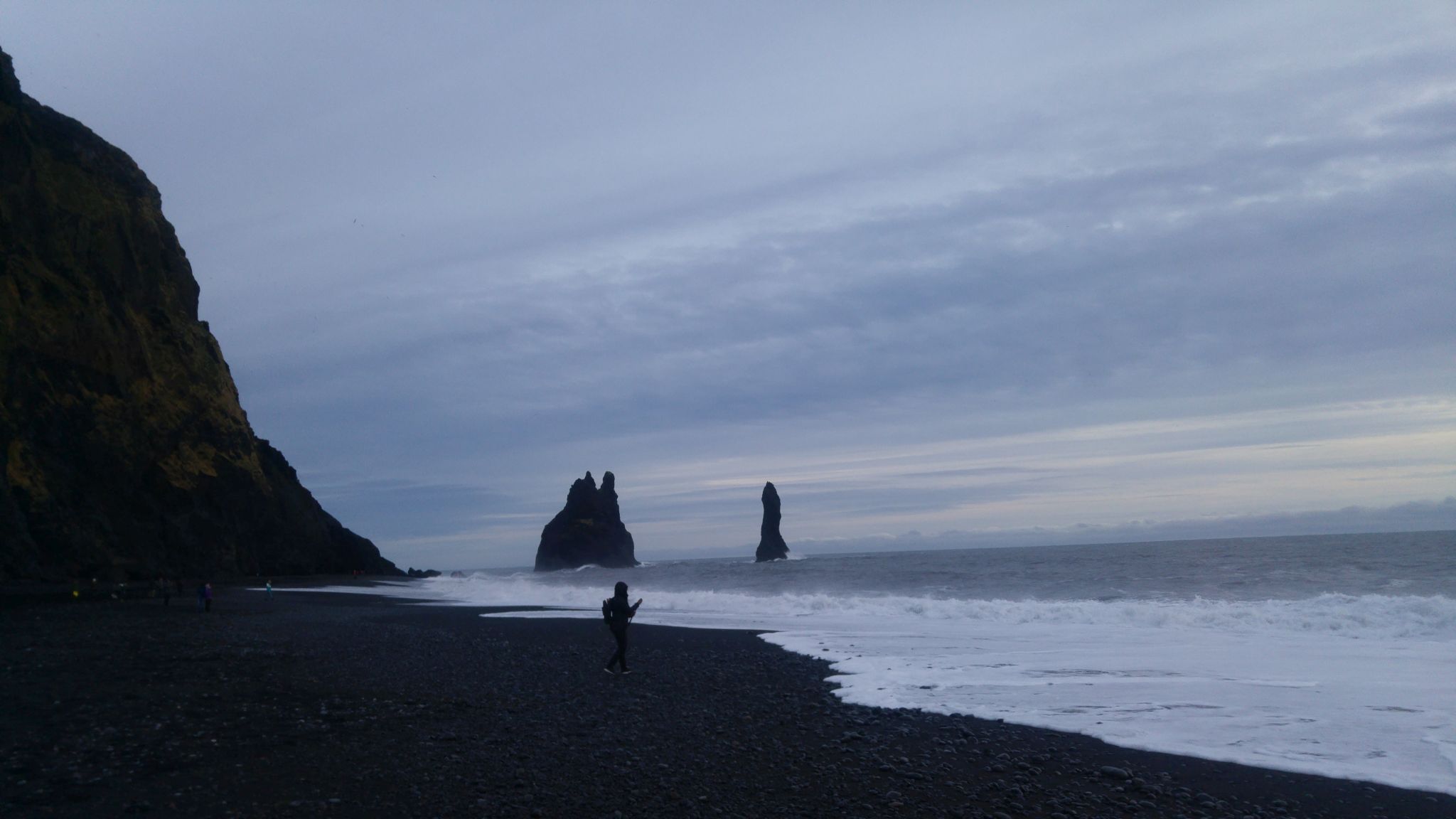 Off in the distance, we would sometimes see individual long-armed excavators doing something or other – digging out ditches, shoring up a riverbank, building a breakwater at Vik. They were distant, lonely, alien. At the black beach of Reynisfjara we joined the surprising number of tourists freezing their faces off to the cry of the gulls and the roar of north Atlantic rollers. There’s a great finger of rock poking out of the sea, a whale skull outside a visitor centre, and most interestingly a little section of Giant’s Causeway basalt columns. Some arch off to form an intriguing cave, where underneath the regularity of the hexagonal prisms dissolves into a gooey fondue of dark stone.