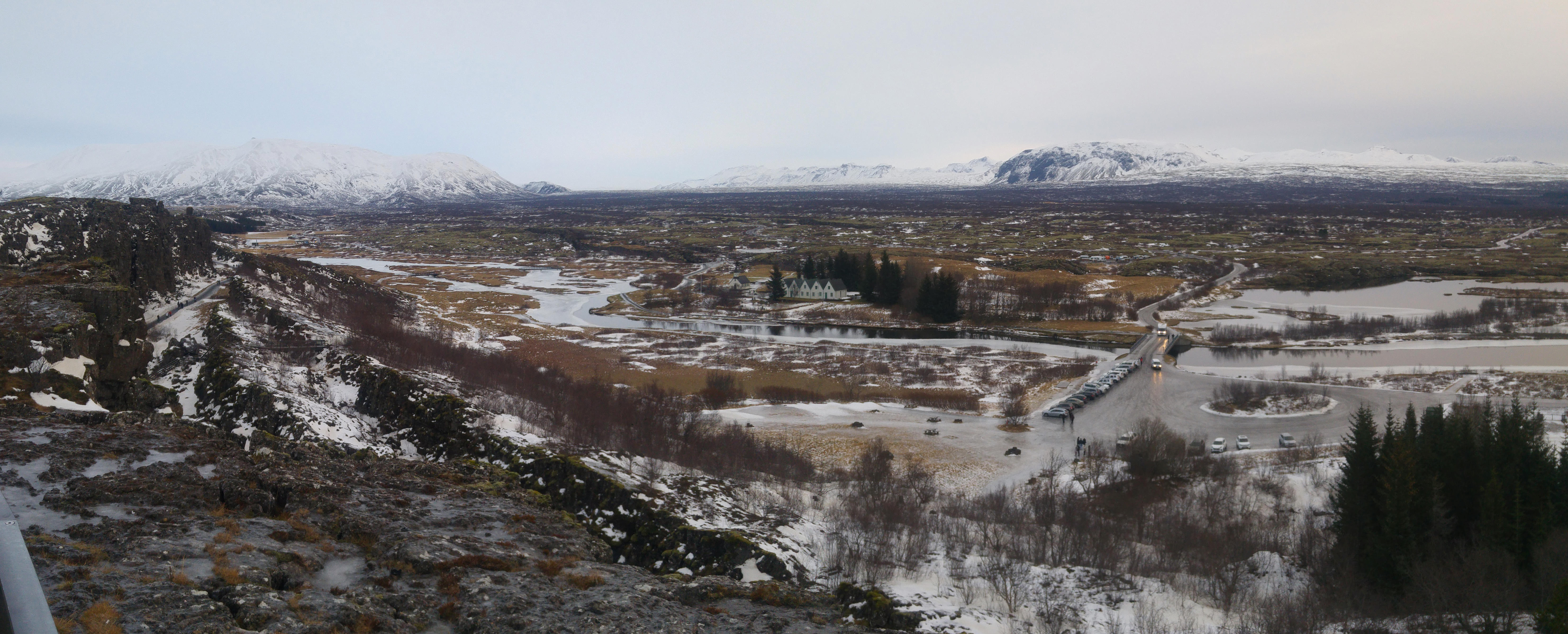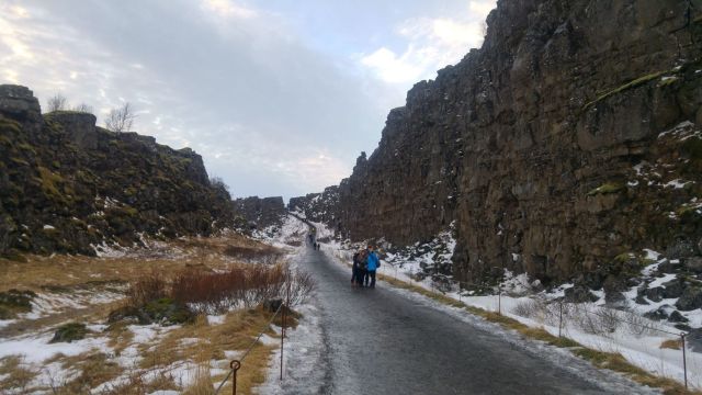 First on the Circle was Þingvellir, where the visitor centre was absolutely rammed with people trying to get in out of the driving cold. This Thing, even at the height of winter impassability, combines the usual highly interesting geology with one of Iceland’s few real historical sites: it’s a rift valley, with steep basalt trenches like the walls of some dark fortress overlooking the site of the “Althingi”, which they like to style as the oldest parliament in the world. The ancient site of the “Law Rock”, where chiefs and freemen assembled to hear the Lawspeaker recite aloud all the laws in force at the time (now wouldn’t that keep your statute book short?) isn’t clear, but it’s still very cool both historically and just as an incredibly striking site.