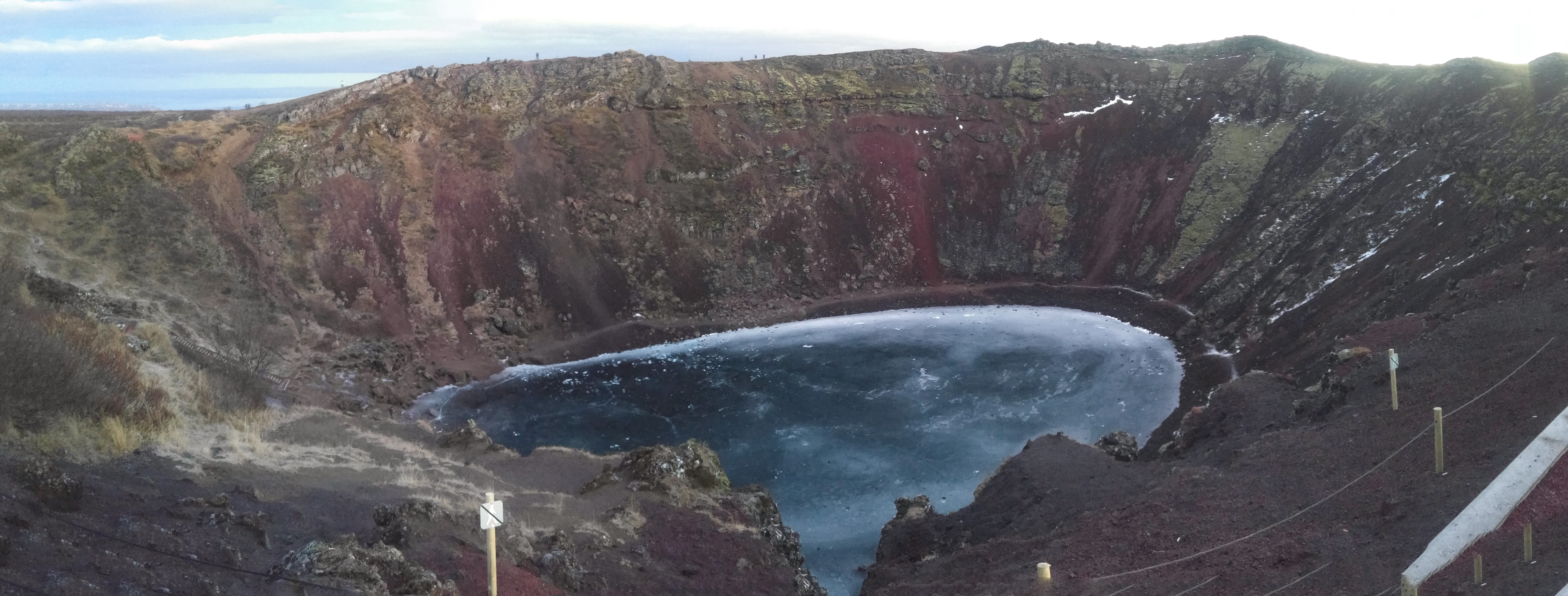 Turning back west to Reykjavik: ahead, a long pink-bellied sunset, behind, mountains fading into a dark grey haze. Two stops remained on our journey back: the cathedral of Skálholt, tall and lonely, unremarkable but for its absolute remoteness, and the crater at Kerið, which we approached just as the sun was finally properly setting. This is a cindercone whose core solidified and then subsided, leaving a far larger and more dramatic crater than the volcano itself would have had. There’s a booth which would charge entrance, but the attendant packed up and left as we arrived, and I was free to walk down the steps into the crater itself, standing on the iced-solid caldera as the dark deepened around me.