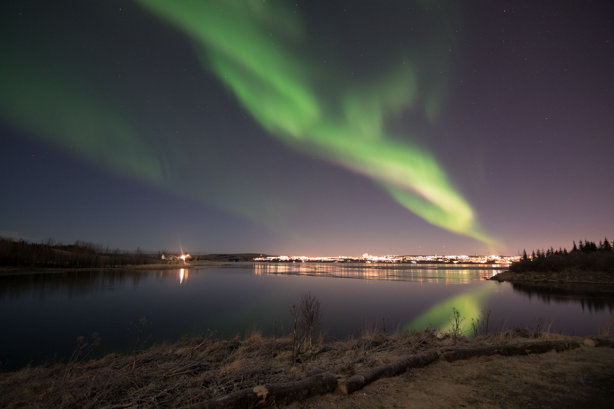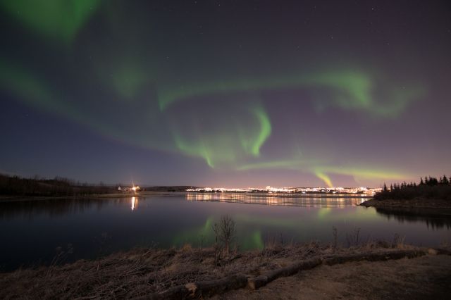 We drove a little way past Thing to the edge of a semi-frozen lake, in hopes of the aurora. We were not disappointed. Long camera exposures showed it as the familiar bright luminous green, but to the naked eye it’s a little less impressive – gobs of washed-out grey-green ectoplasm, more like clouds behaving in weird ways than the emerald nebula it’s generally portrayed as. There’s a hint of green, but also a general vague chromatic uncertainty to it, like a half-seen waterfall haze. It moves in the most startling ways – whole sections suddenly drizzle into sight, like dust trickling through a projection; a great wheel of particularly bright light whirled and swirled around in an entirely random way; at one point a whole long section appeared and half-disappeared, like a curtain drifting in and out of reality. Less beautiful and less defined than the photos make it seem, but entirely unique and absolutely unsettling.