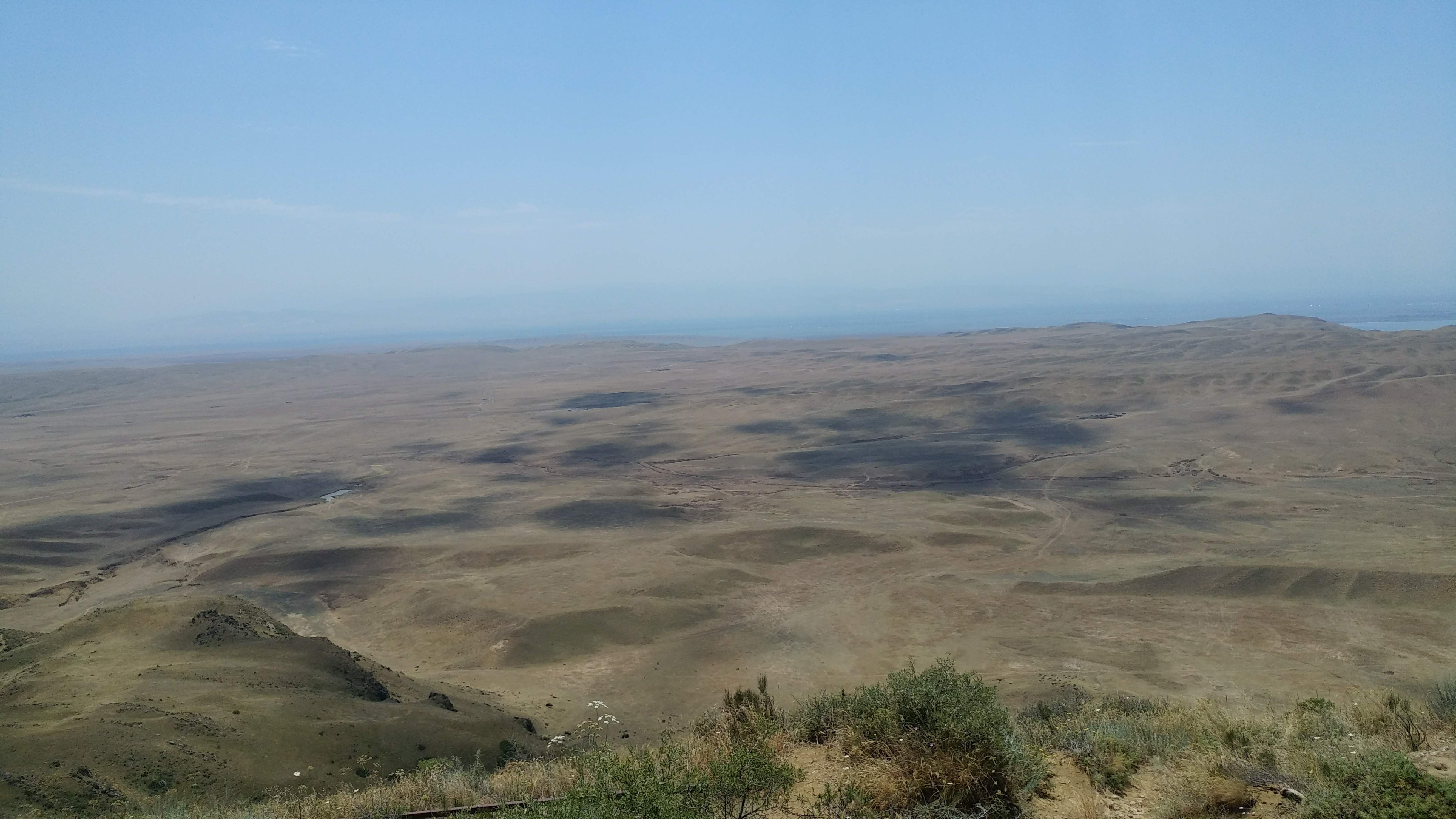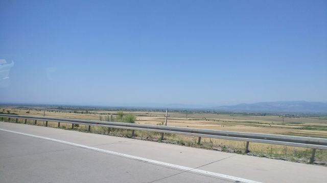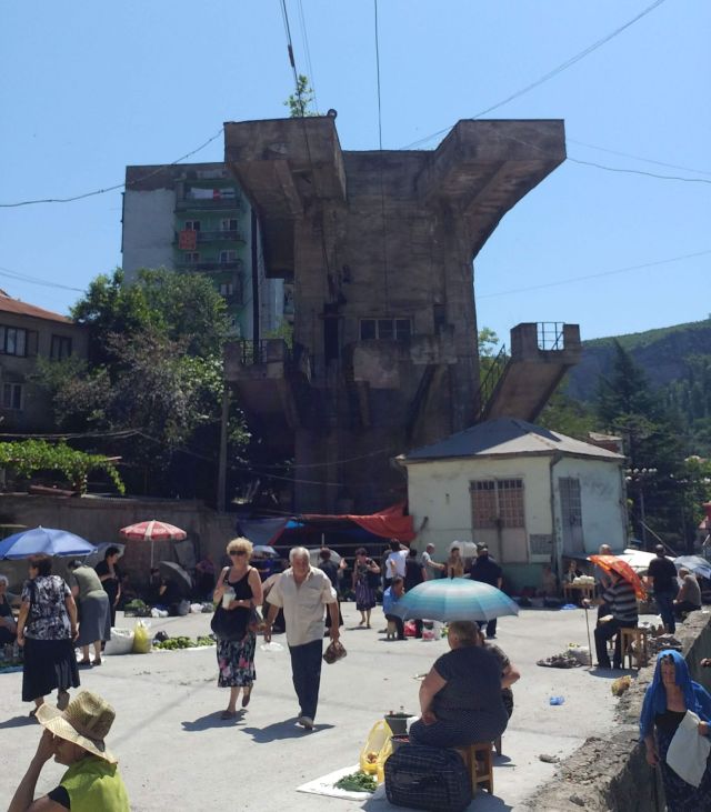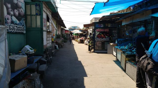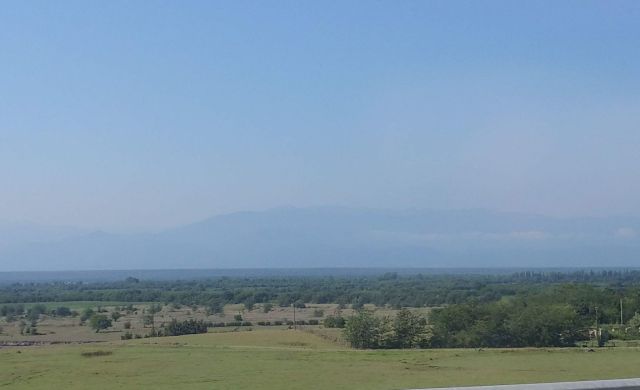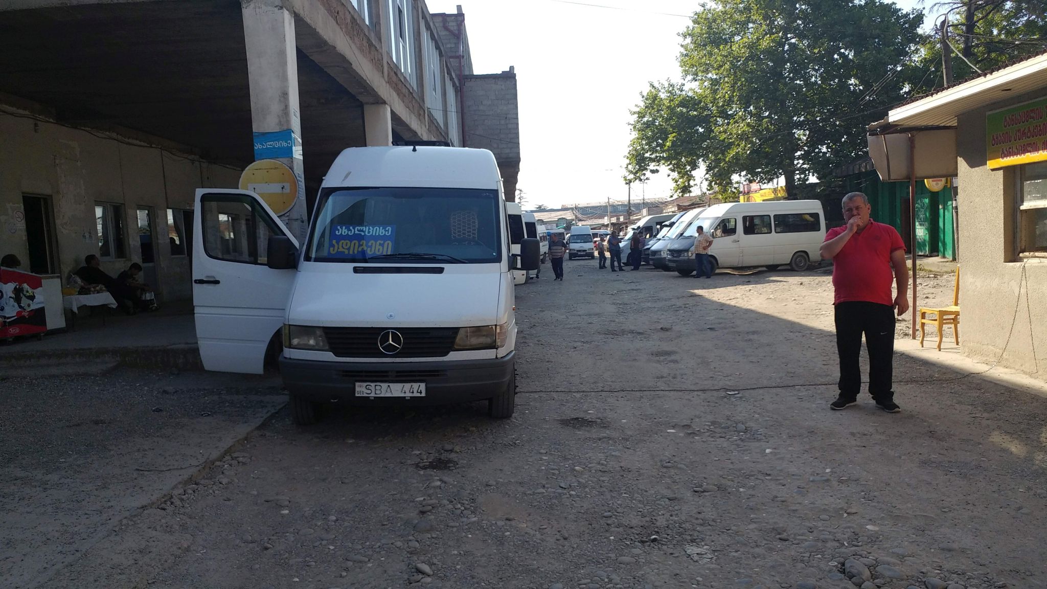 Water sprayers were about on the streets of Vake as we left, damping down the dust and making the air deliciously cool. We rode the Metro to Didube station, across the river from something marked DIGHOMI MASSIVE on our maps, and decamped into a chaos of numberless minibuses. Getting the right marshrutka was as simple as making eye contact with one of the blokes at the metro station. “Marshrutka? Batumi?” “Akhaltsikhe please.” “Akhaltsikhe! Follow. Here.” “How much?” (Ten fingers.) “When will this go?” “When ready.” With the bus mostly empty, we figured we weren’t in a great rush, and it was equally easy to find some cheap pastries in among the market-stalls there (through the time-honoured tradition of pointing at random appetising-looking ones).