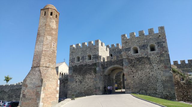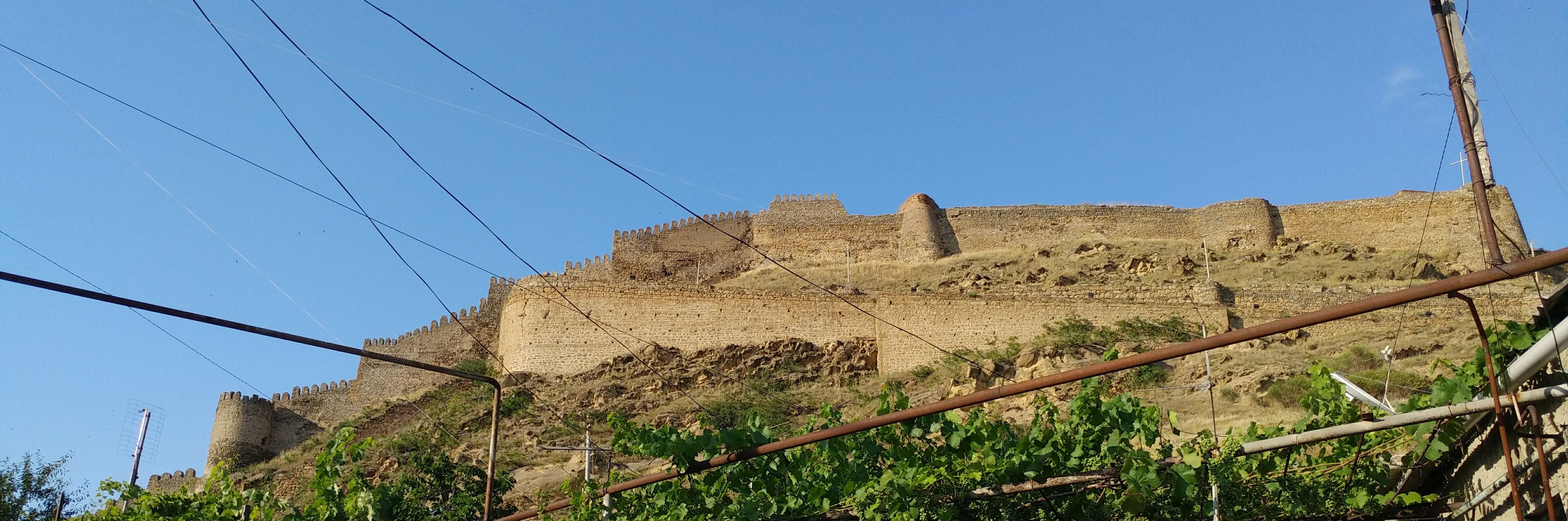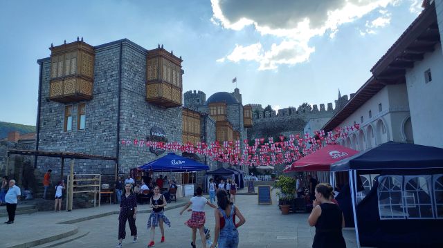 We had found rooms at the “Happy Holiday” guesthouse (linked ‘cos it’s very highly recommended). The room was clean and well furnished; the host couple spoke little English but their 12-year-old daughter was a splendid translator, and the stickers on the door forbade us from smoking cigarettes, e-cigarettes, and hookah. We showered so we wouldn’t be Akhaltsticky, had a splendid lunch round the corner, and then headed up to the new castle.