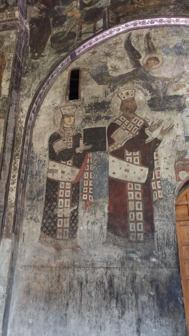 I hiked up the hillside to the base of the complex, rather than wait for a minibus; there were a handful of other tourists there, some American, some Russian. The exposed architecture is weathered to abstraction, and I needed the guide to explain most of the chambers. There were buried stables, refectory chambers similar to those at David Gareja, rooms with huge ceramic wine vessels buried in the floor. A belfry with martens nesting in its carved eaves is one of the rare parts of Vardzia which was actually meant to be above ground. Deep within the mountain, accessed only by a hundred yards of bent-double crouch-walking, a clear spring next to a floodlit chapel gave a real, rare sense of serenity. The audioguide was filled with explanations of sneaky ways the locals would wall themselves off in times of trouble (with only one main entrance and exit to the city). And wonderfully, the core holy site and the most artistically important part of the whole complex has survived very well: the Church of the Dormition, with its ancient but decently-preserved paintings of angels, saints and Tamar the Great.