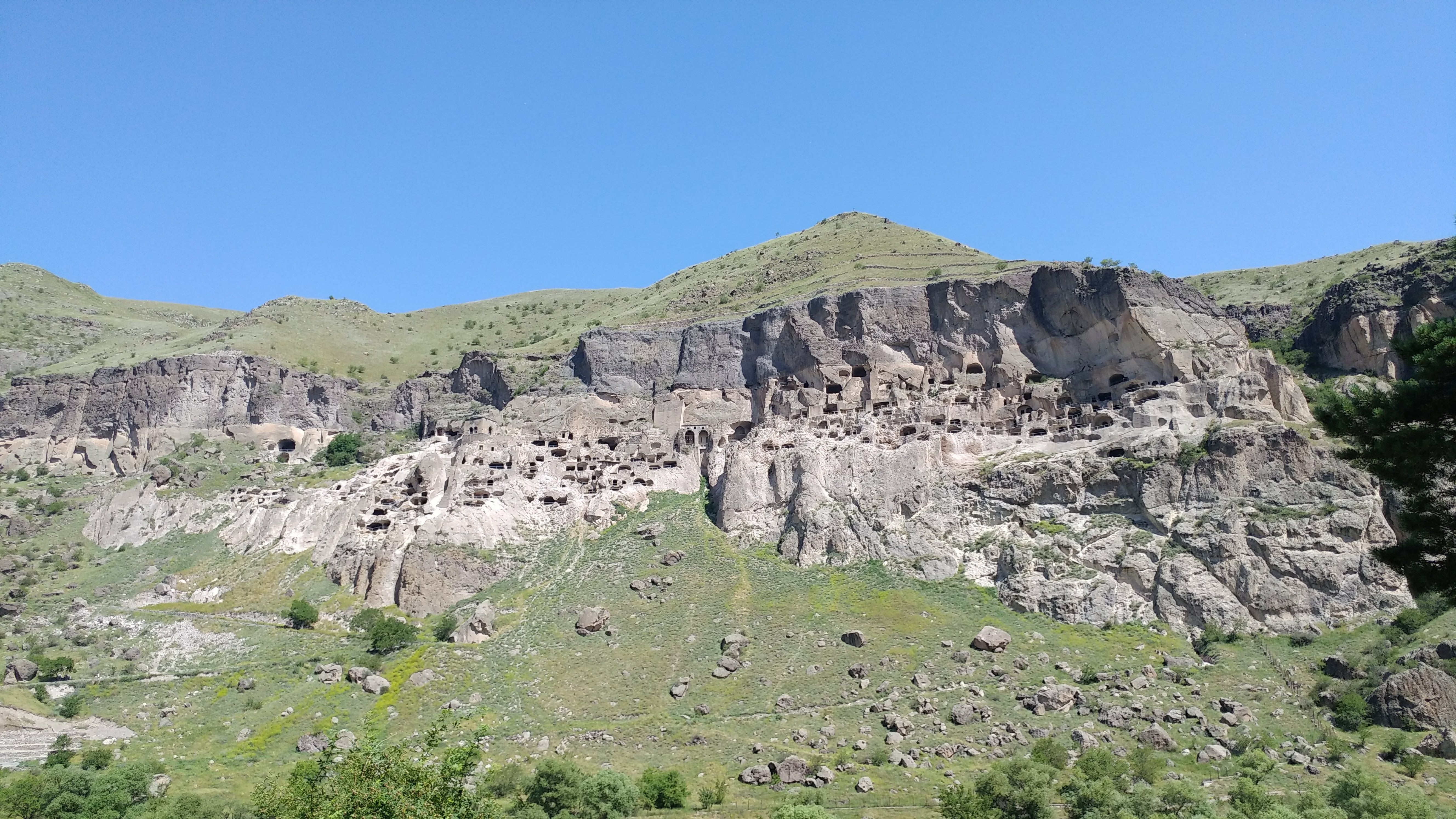 The Vanis Kvabebi complex (“Vani’s caves”) is if anything even more interesting than Vardzia, because it’s easier to understand how it worked in its golden age. A triangular settlement, two sides defined by a deep V-shaped notch in the canyon, one a massive fortification still impressive eight hundred years later. The open-air buildings are mostly now outlines and wildflowers, but the cave dwellings remain in decent nick. A segment of the dome of a fallen church is visible above an altar; in the caves, ancient wine-vessels cut ceramic-lined circles in the floor. Above it all, a tiny dome perches like an eagle’s nest (see if you can find it in the pictures), supposedly lined with ancient calligraphy. My guide was eager to show it off, and borrowed a key from a bearded monk who seemed to appear from nowhere, but a long, steep, rickety pathway and a makeshift ladder later we were wiggling it without effect in a lock. Maybe the lock needed oiling; maybe the monk didn’t like our faces.