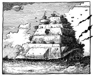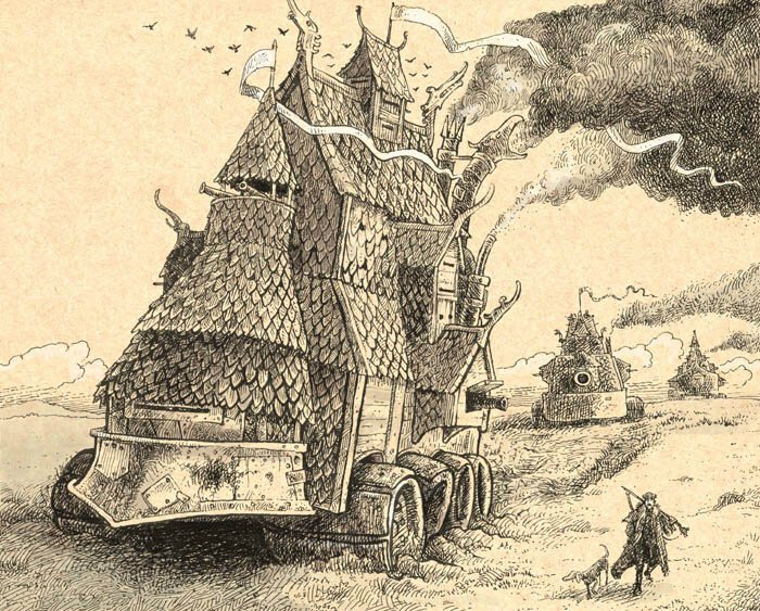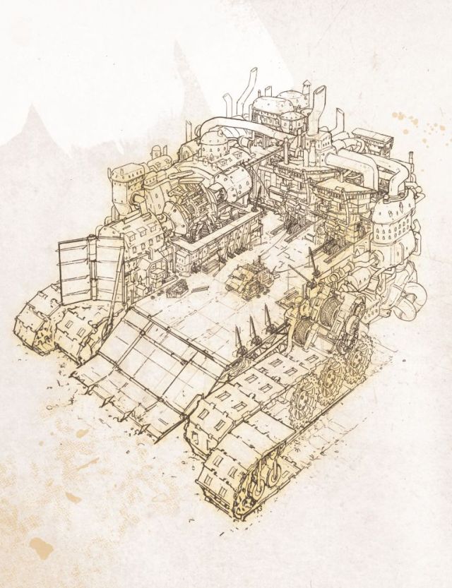 The IWOME developed through a long period of writing, hashing out ideas and improving the general structure. One of the issues which emerged, which we never really found an answer to, was that going into the Storm and their war with the cities was a big distraction from the original story of Mortal Engines. Worse, due to the limit on the length of the book and the time pressures of getting illustrations for all the other new stuff in, there wasn’t really time or space to do the Green Storm War justice. So the Storm, and the war, are alluded to but don’t feature heavily in the IWOME.