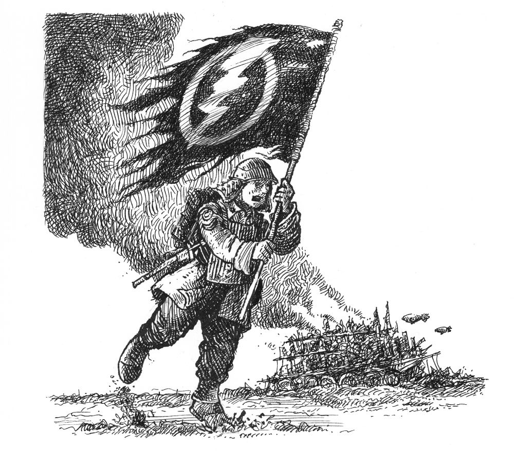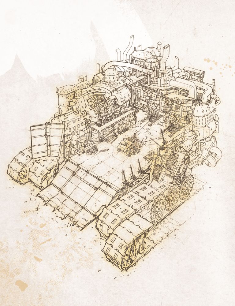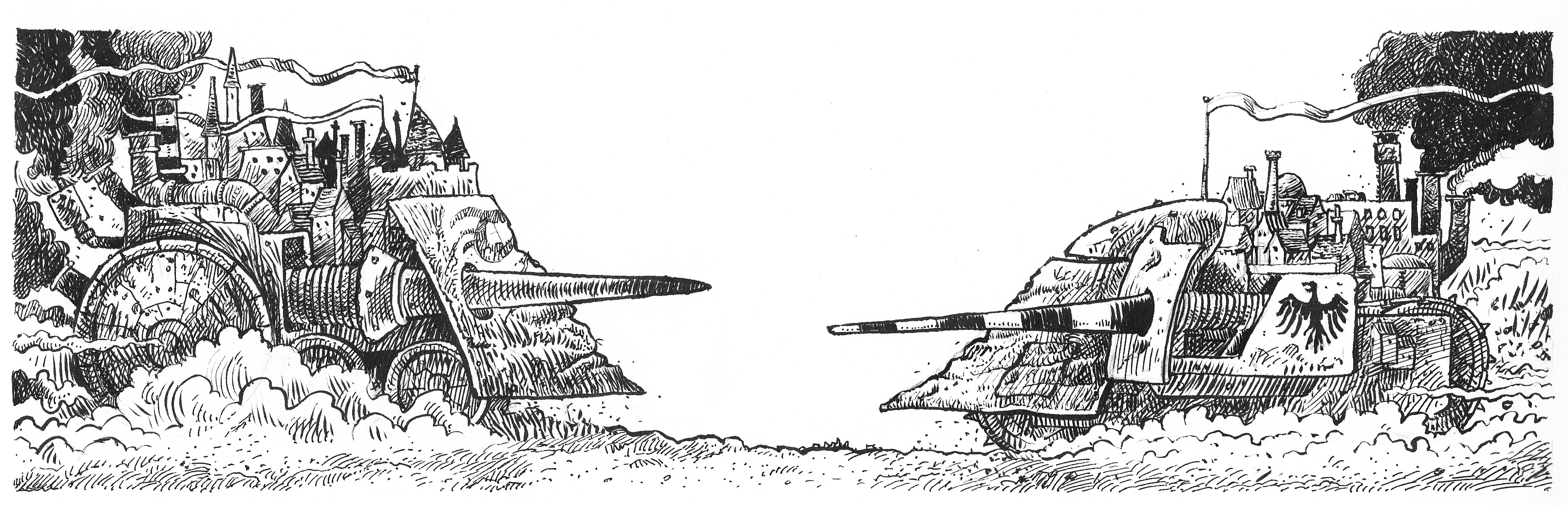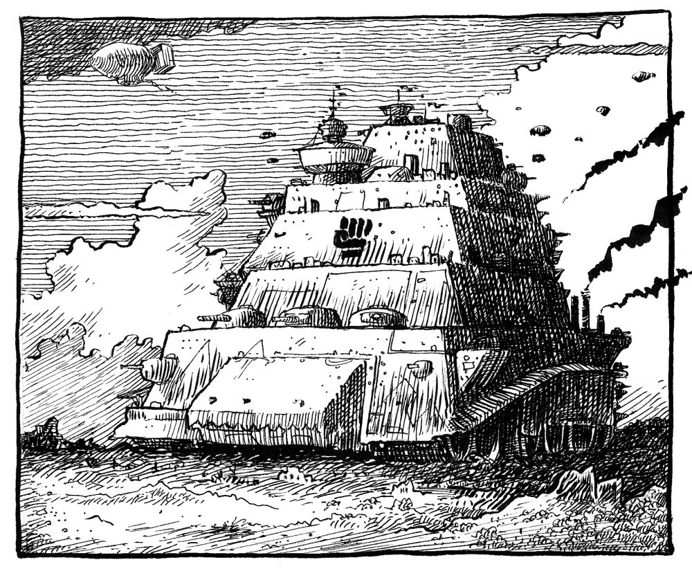 e the early drafts of lots of material – hydrofoil swarms and shaped-charge lancers, the Battle of the Bay of Bengal, increasingly grotesque and ludicrous applications of Stalker technology – and on the Traktionstadtsgesellschaft side, a heap of mad flying machines, armoured fighting towns and an effort to create the Longest Possible German Compound Noun (“Traktionstadtsgesellschaftstandardausgabeverteidigungsreihenfeuerpistole”). Perhaps, one day, we’ll get to come back to them, and the world will see a beautiful professional illustration of the abortive “Stalker walrus”.