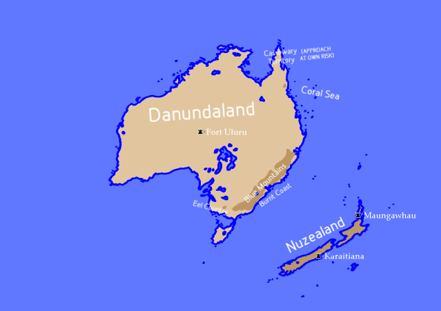 An interesting issue we discovered with the maps, playing around with sea levels and continental plates, is that you can do some absolutely horrible things to continents and and they still don’t actually look that different. Take Nuevo Maya here: most of the important rivers have completely changed course, a million square miles of slightly salty pampas have risen out of the sea, the Falklands are no longer islands and the Panama isthmus is no longer anything… but it’s still instantly recognisable as South America. But, put it side by side with an actual map of South America, and you’ll see quite how different they are.