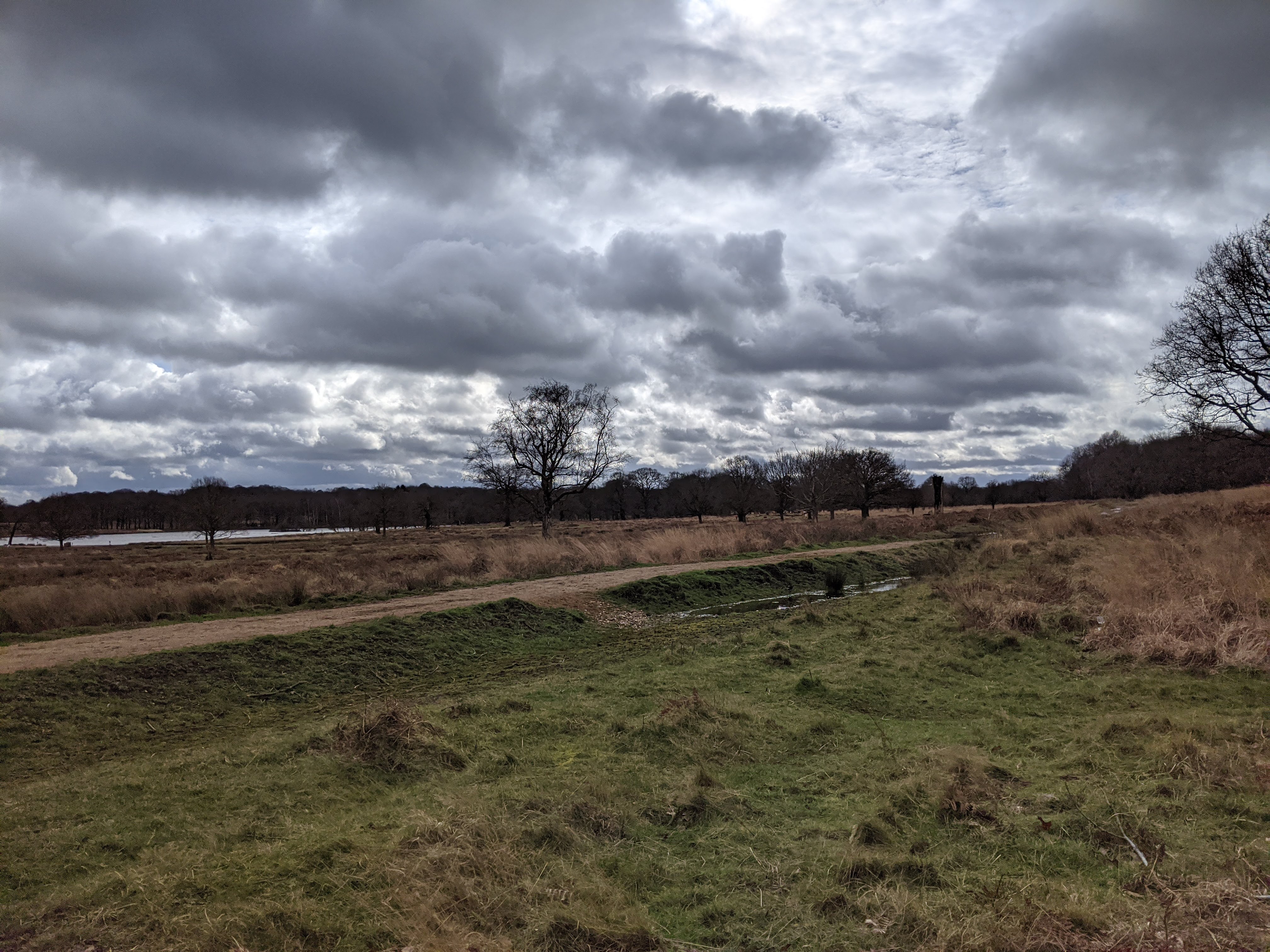 Richmond Park, designated as a hunting preserve by Charles I but far, far older, is the largest and easternmost of London’s royal parks. It’s big enough and wild enough that you can imagine yourself in the open country, rather than with London bustling all around – until you glimpse the glint of a skyscrapers on the horizon, or the jets coming into Heathrow break the silence. The trains of southwest London are abominable on a Sunday, with any number of lines just not working like they ought to, but I managed to get to Richmond station and, a happy surprise, was almost immediately hailed from a coffee shop by an old boss. London sometimes feels like a very small place.