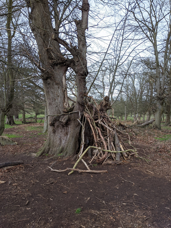 At a cold, grey, two-stage lake, strong winds blew little zephyrs of ripples away from us and a pair of swans held their heads low to look menacing. Someone, or several someones over some time, had been building shelters by stacking branches against hollow trees. We found one very nearly big enough for the three of us, and hid in it the rain suddenly swept in, drinking tea from a thermos and eating some excellent homemade banana cake.