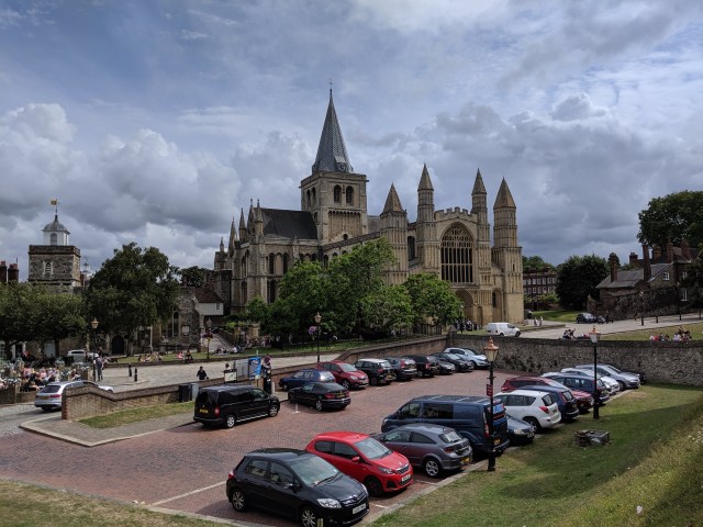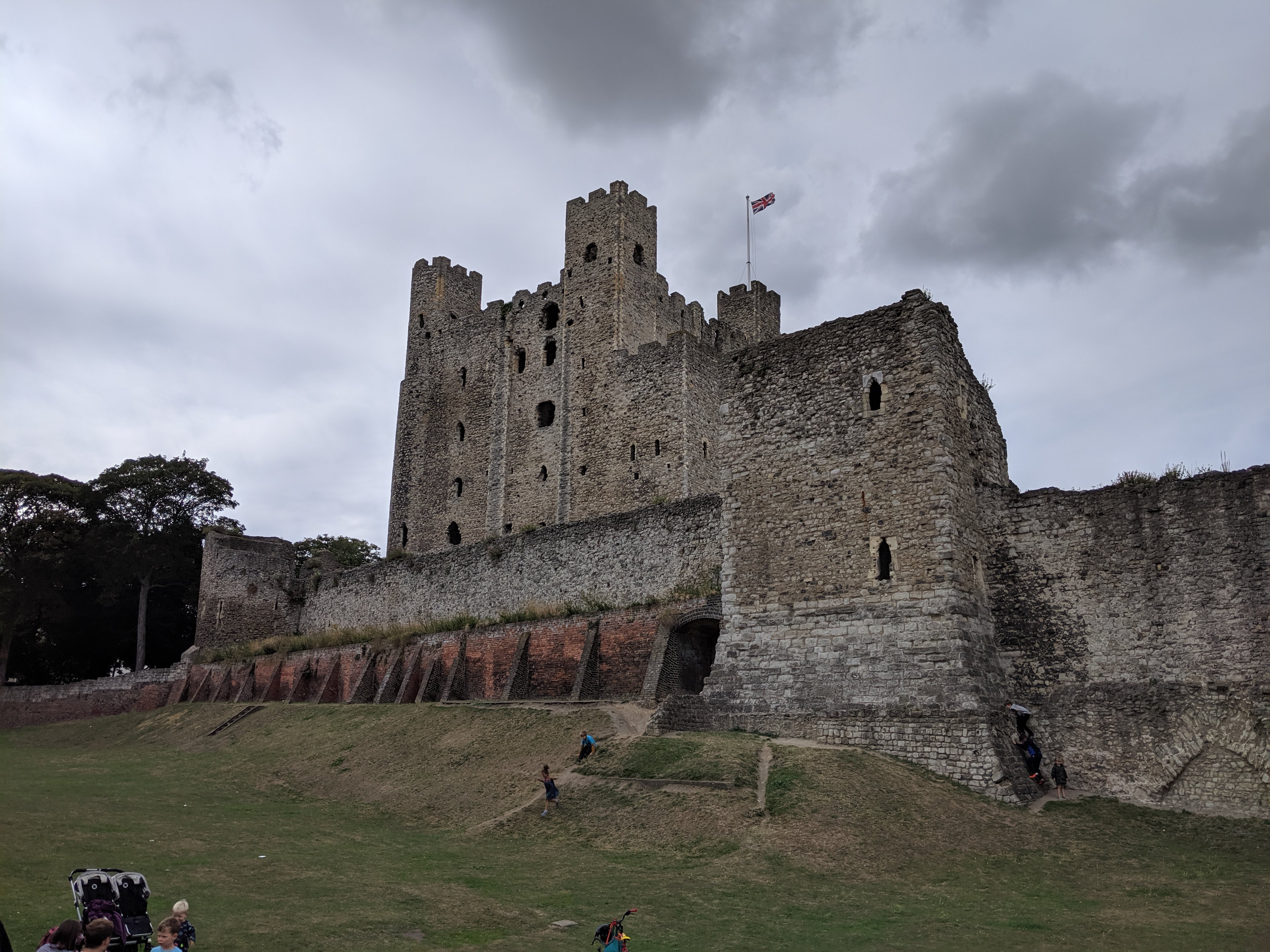 The castle is of the same basic design language as the Tower of London (although built a fair bit later): a huge solid militaristic cube with towers at each corner, within later rings of concentric defences. It’s in considerably poorer nick than the White Tower,  having had fewer prison/mint/arsenal side gigs in the intervening centuries and being completely obsolescent in its main role a fort by the 17th (which may have spared it from Cromwell’s general castle-vandalising after the Civil War). But this means that the interior hasn’t been mucked about with much, and, thanks to the lack of floorboards, you can see five storeys of gorgeously carved Norman arches and immensely impressive columns in the middle all at once. From the platform at the top, we can see the Garden of England in all directions, much of the visual interest coming from the Medway estuary with its rather lost-looking Soviet submarine.