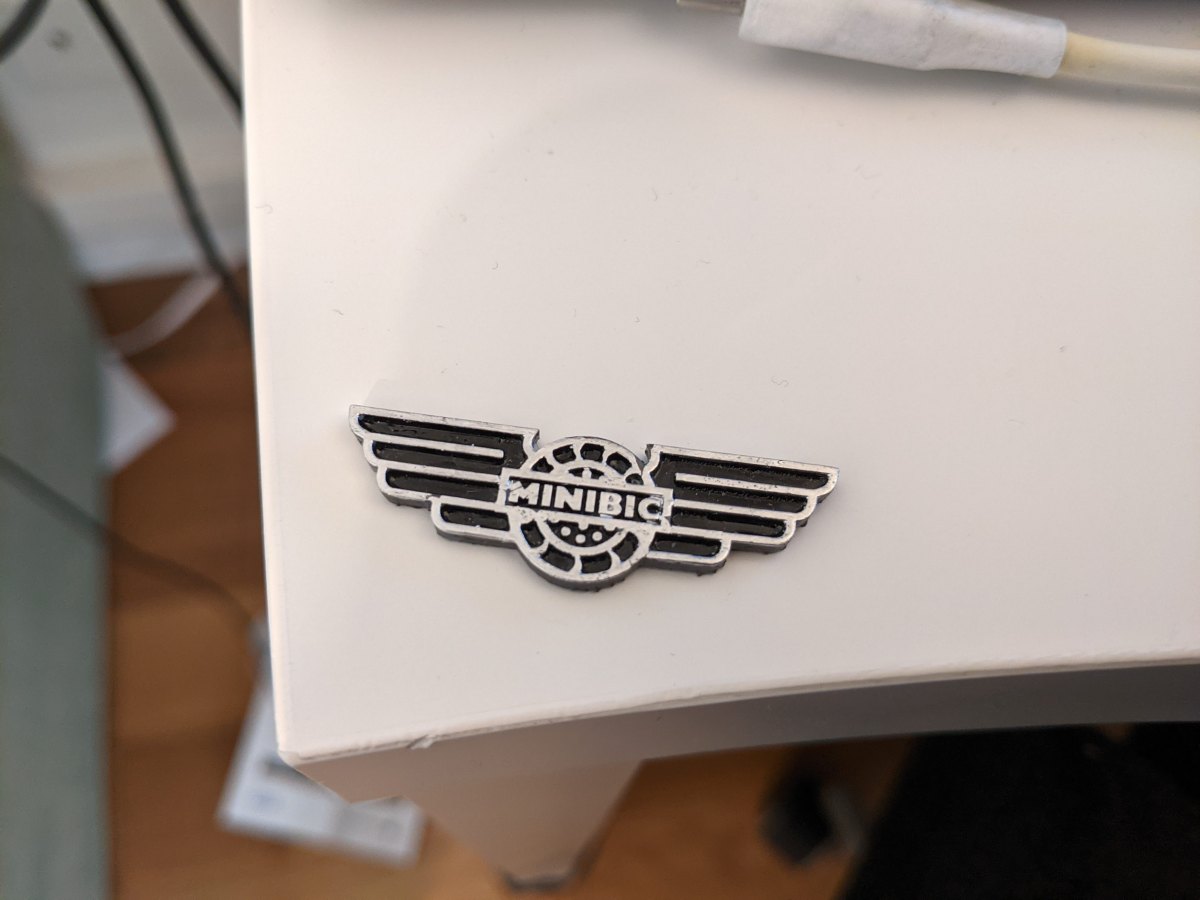 I found a decent-res version of the Minibic logo online. I cut the ministry’s motto, made a filled-in copy as a backing layer, converted them both to .svgs, imported them to Tinkercad, set the appropriate dimensions and stuck them together. Easy! As usual, the most time-consuming part was set adding supports so they’d print properly.
