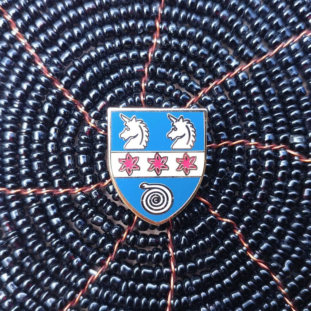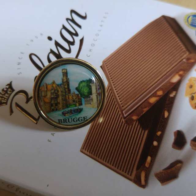 Bought while passing back through Belgium coming back from the trip which also involved badge #13. We climbed the cloth hall tower, stopped for moules frites in the square, and talked about what a fackin fairytale fackin town it is, how can that not be someone’s thing? (Not technically an enamel pin! A portrait pin, with a printout under an acrylic dome on a metal back. Nice in itself, but I feel not as interesting as the cloisonné style you get with enamel. Maybe I’ll go back some day and get another.)