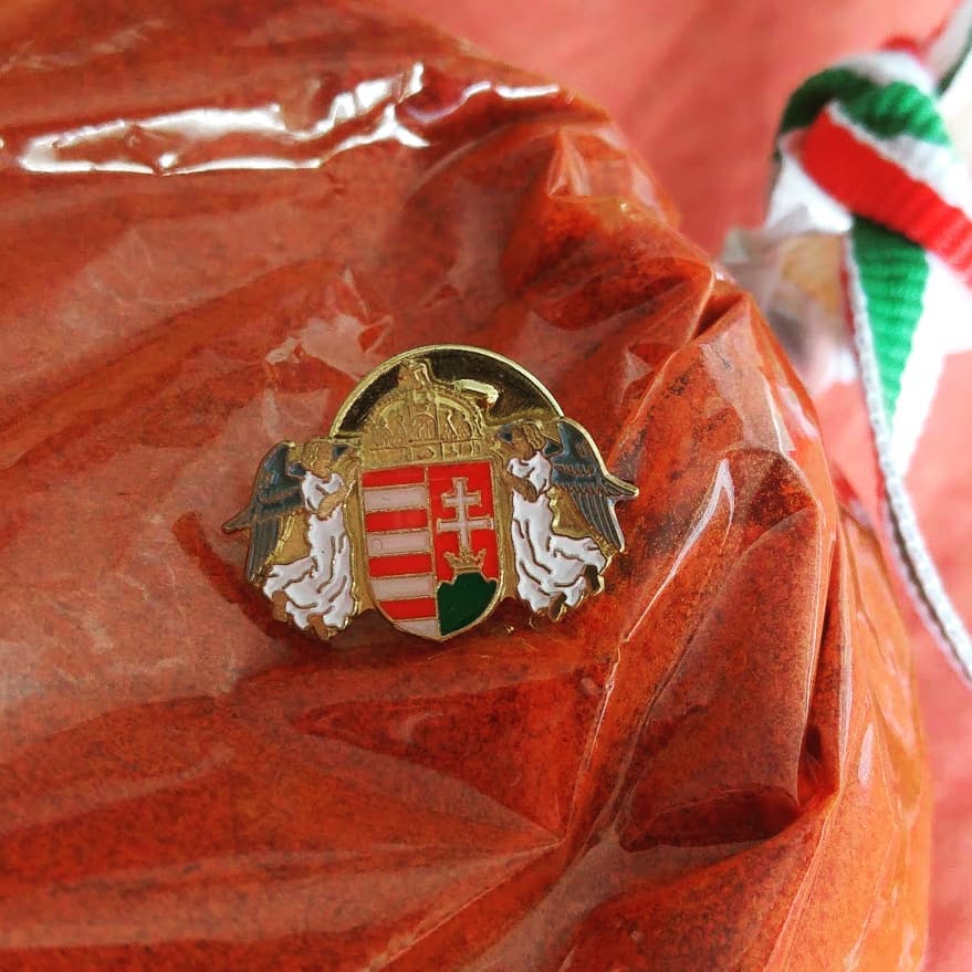 Another trip to Budapest. This is the Hungarian coat of arms (note the tiny tilted cross on top of the Holy Crown of Hungary), on top of a small sack of good Hungarian paprika.