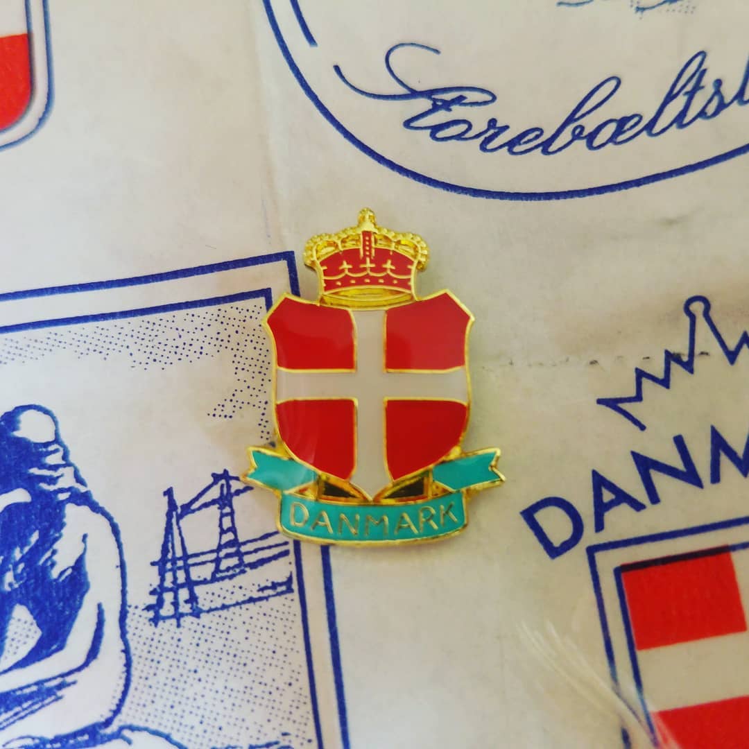 From a visit to an old Danish pal in Copenhagen, a pretty little badge with the Danish coat of arms. Background is the paper bag it came in – note the Little Mermaid statue.