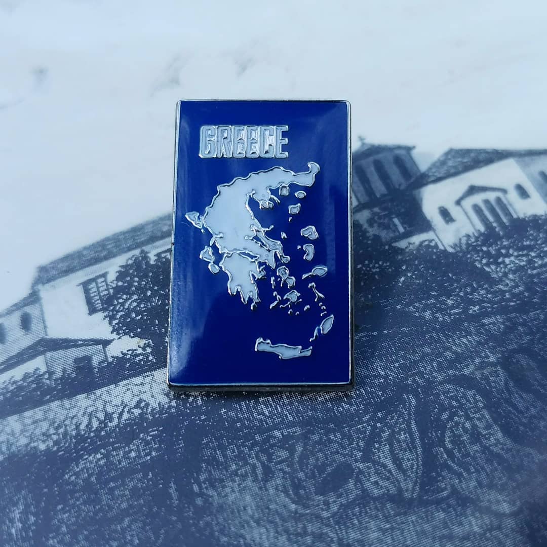 The pin habit had become well established by the time I bought this souvenir of my first proper holiday with my partner. We spent a week in Greece, spent largely in Athens but with day trips out to the Meteora (a poster of which is the background), the islands of Hydra, Poros and Aegina, and an unplanned but lovely extension in Kalamata caused by an air traffic controller strike.