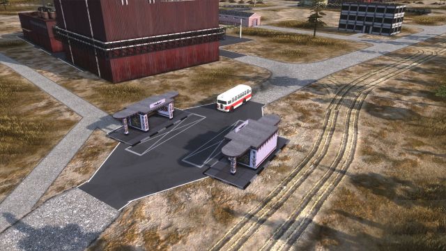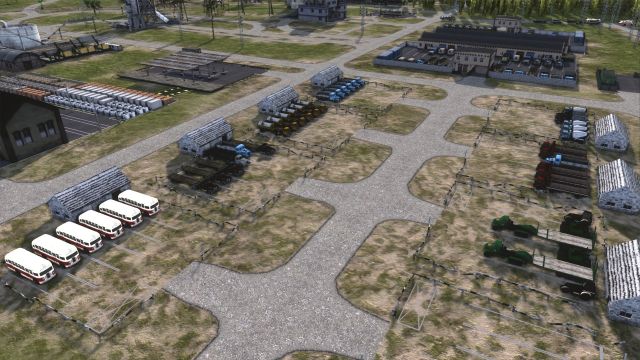 First is the construction industry. At the most basic I’ll need: gravel for gravel roads and as a component of concrete and asphalt; concrete and asphalt (both of which have to be made by me just before they’re used); an open storage for boards, bricks, steel and prefabricated concrete panels; and a covered storage for mechanical and electrical components. I’ll also need bitumen (for asphalt) and cement (for concrete), which I’ll make later but for now will have to be trucked in from the border. Finally, I need a bus stop to bring in workers for the gravel processing, asphalt and concrete plants. And, er, a town for those workers to live in.