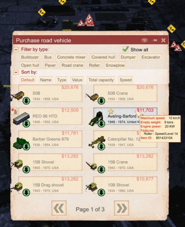 I want to build some asphalt roads, but these require rollers and asphalt pavers and there aren’t any Soviet ones available, so I need to spend more dollars. It’s not worth building these (the blueprints are very expensive), so I’m just buying a couple outright.