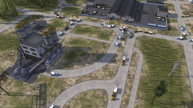 Feat: gravel quarry [offscreen], rock-crushing facility to process it [1], storage as a buffer [2] and an unloading dock to fill lorries quickly [3]). Conveyors feed this to buildings making cement [4] and asphalt [5], served by workers from a bus stop [6].