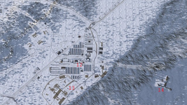 1. the town of Alexandrov; 2. small-scale oil refining and hydropower generation; 3. bauxite mining, processing and export (under construction); 4. the customs office through which I import goods by rail; 5. the main construction offices and materials storage/manufacture; 6. road and rail vehicle production complex; 7. steelworks and coal processing; 8. coal mines; 9. further planned coal mines in a loop up a shallow valley; 10. planned coal power generation fed and staffed via cable car; 11. planned iron mines and processing; 12. the city of Belogorsk; 13. planned brickworks, cement and panel factories; and 14. a planned mountaintop logging.