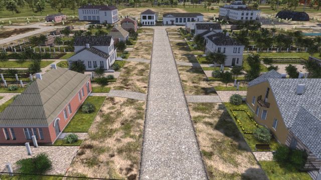 Here is Alexandrov, my first town. Note that everything is in walking distance of the houses, and lots of building foundations for further districts which I’ll build myself.