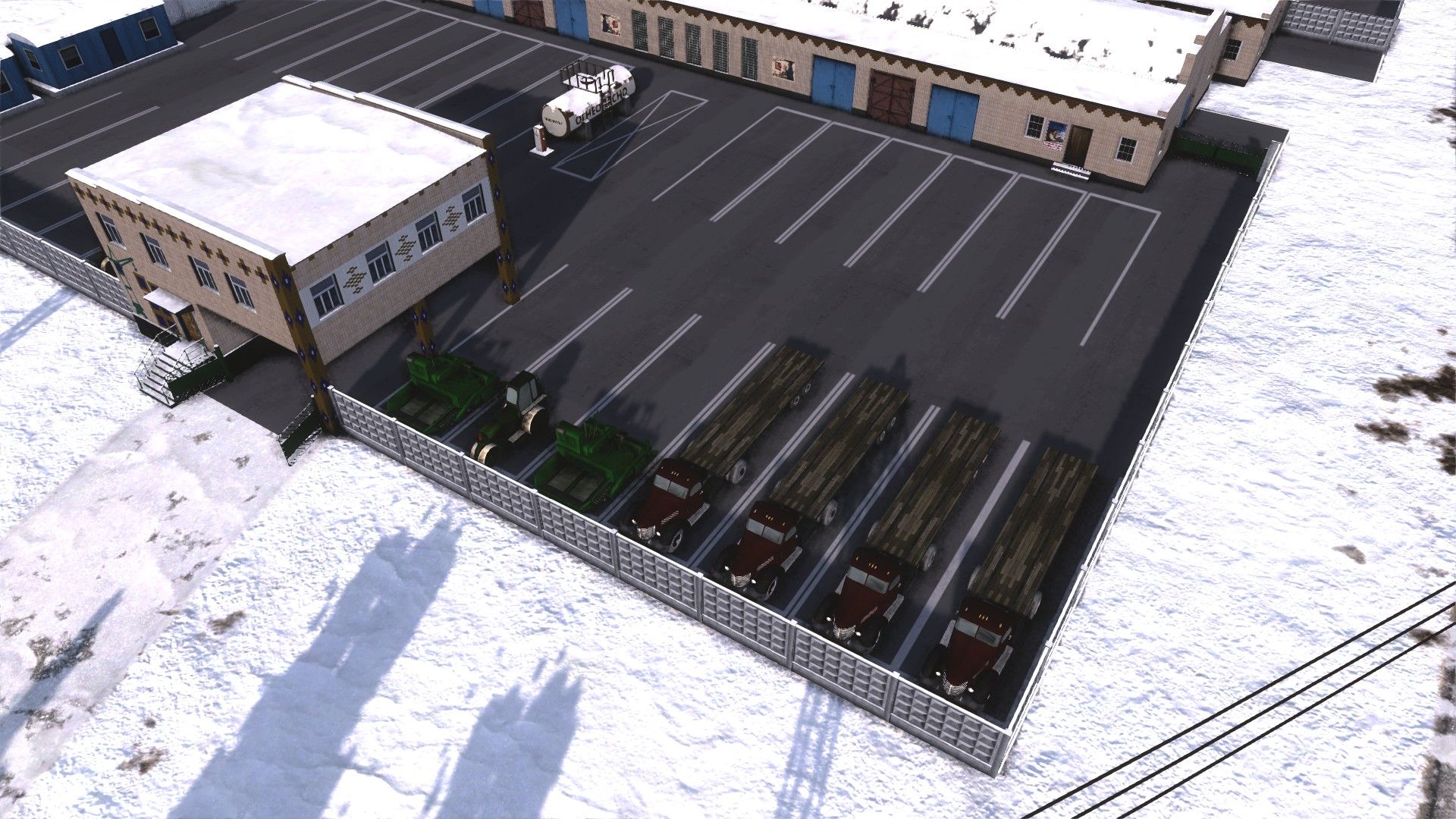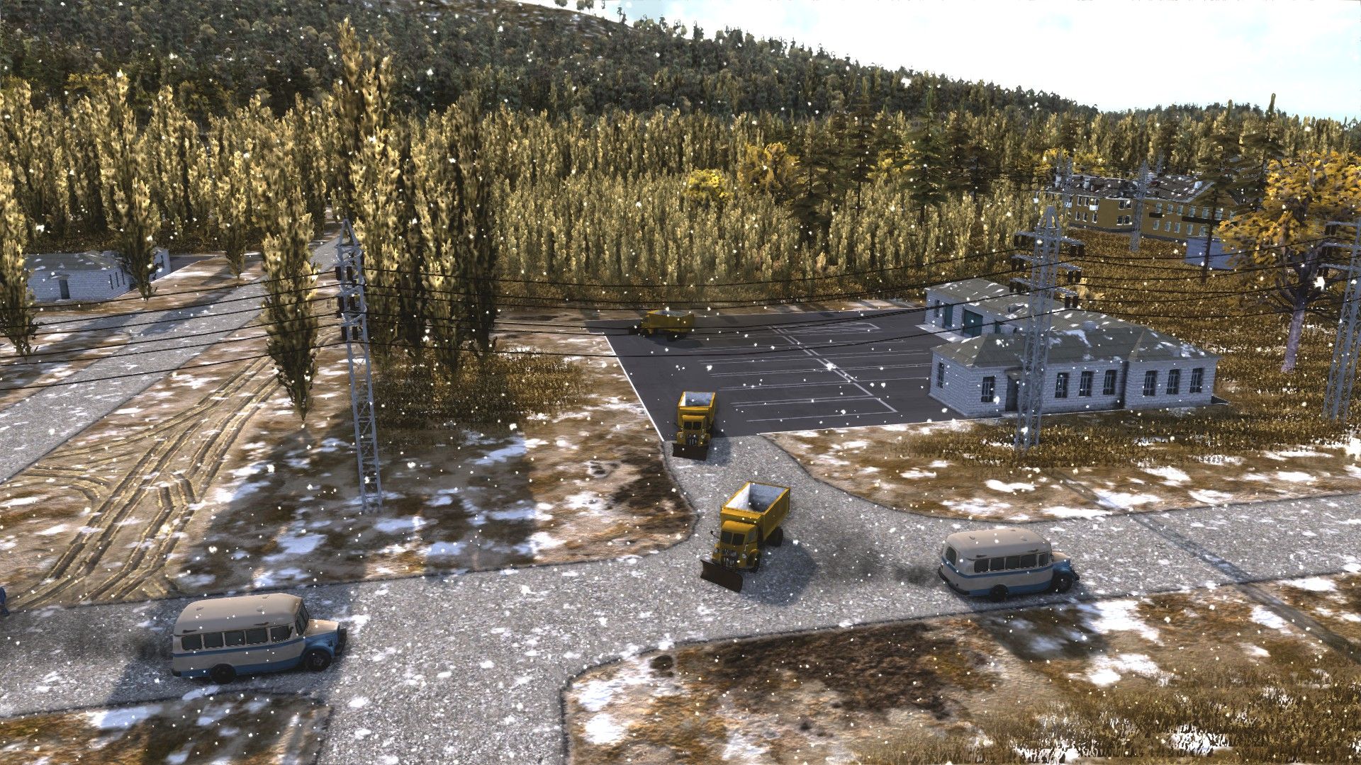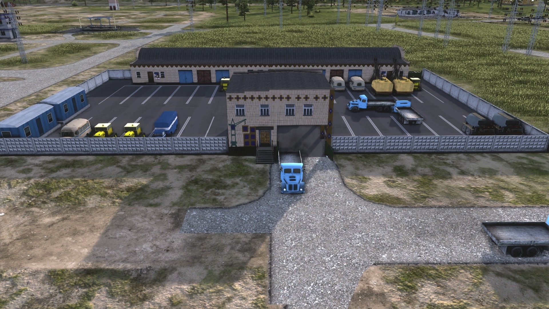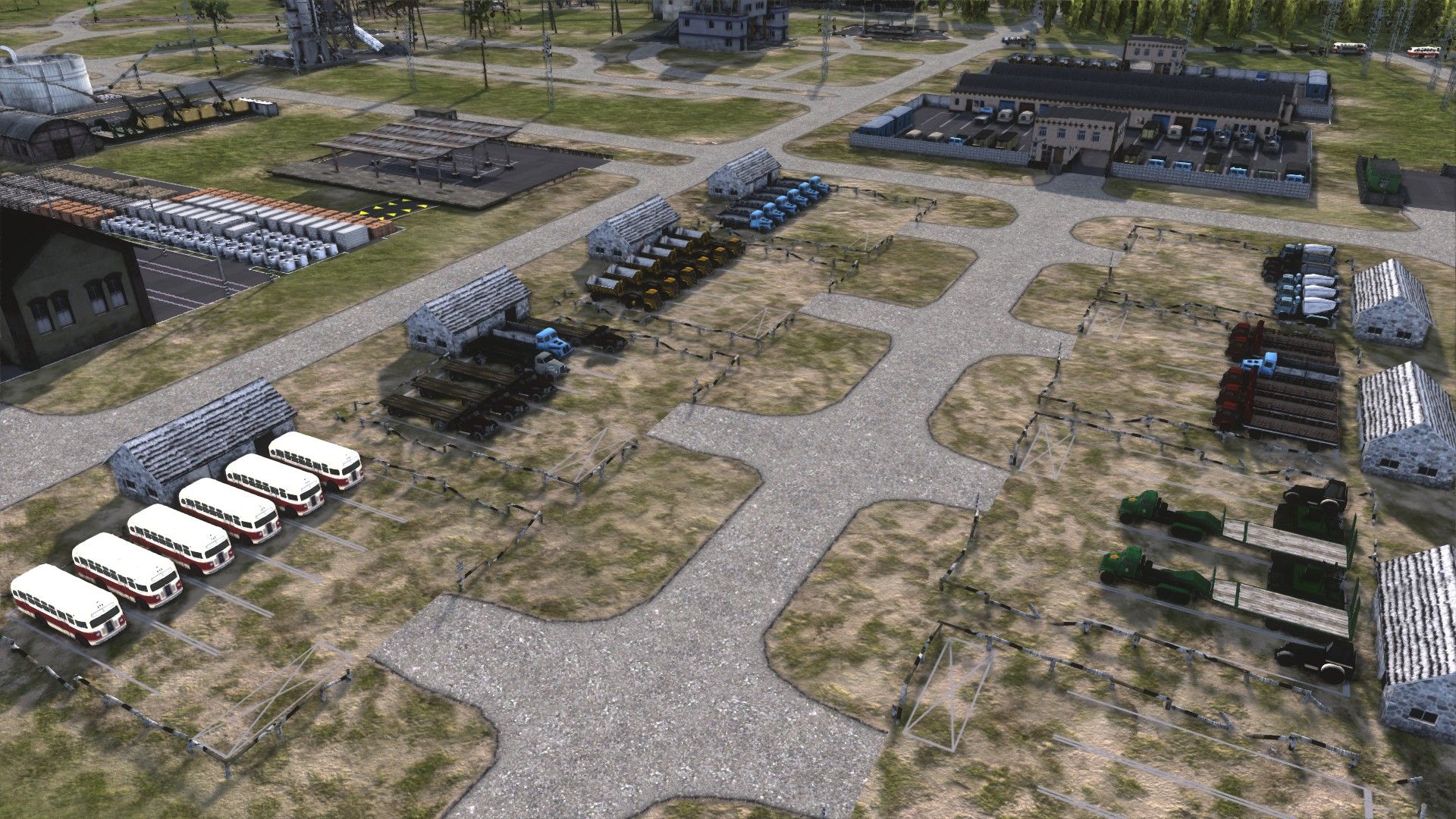 The construction office: buses, flatbed lorries, dumpers, more dumpers, cement mixers, more flatbeds, and rollers/pavers. In the background, three more construction offices with excavators, cranes, minibuses, and more dumpers; to the left, the huge storage yard full of construction materials.