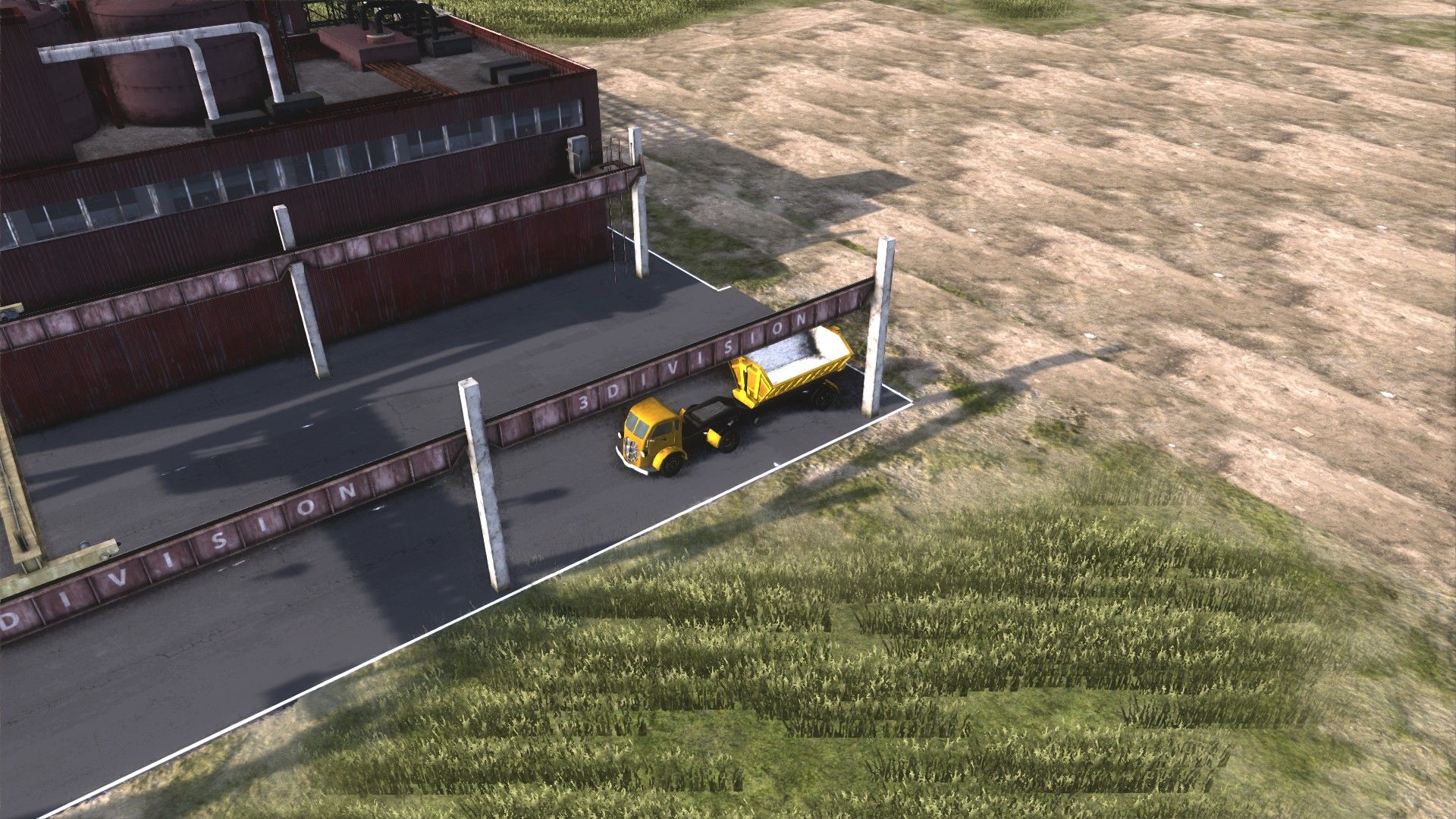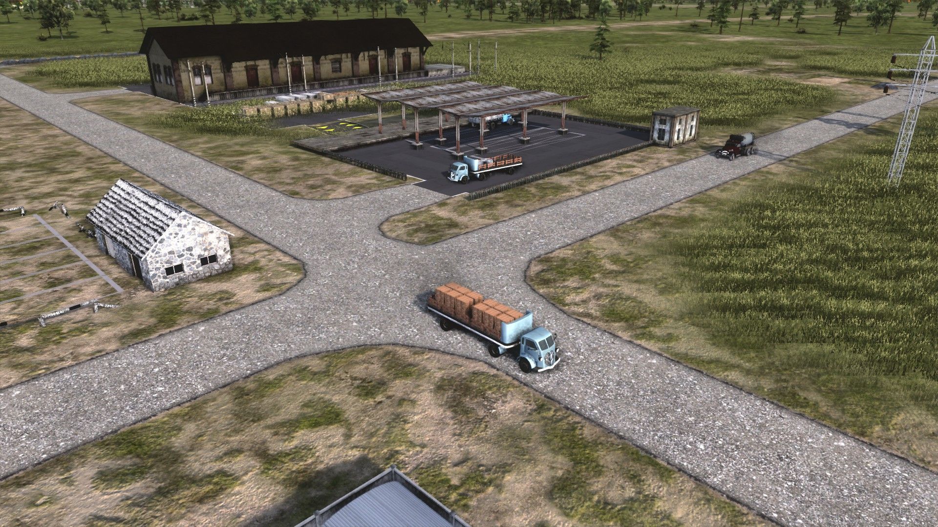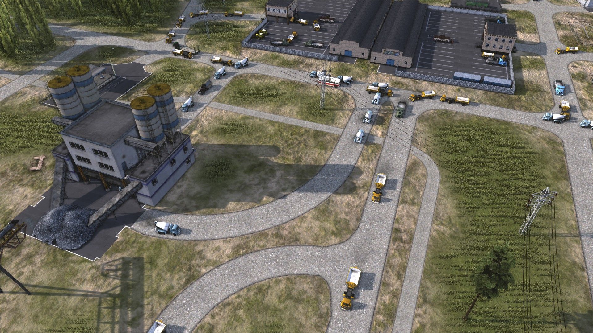 First is the construction industry. At the most basic I’ll need: gravel for gravel roads and as a component of concrete and asphalt; concrete and asphalt (both of which have to be made by me just before they’re used); an open storage for boards, bricks, steel and prefabricated concrete panels; and a covered storage for mechanical and electrical components. I’ll also need bitumen (for asphalt) and cement (for concrete), which I’ll make later but for now will have to be trucked in from the border. Finally, I need a bus stop to bring in workers for the gravel processing, asphalt and concrete plants. And, er, a town for those workers to live in.