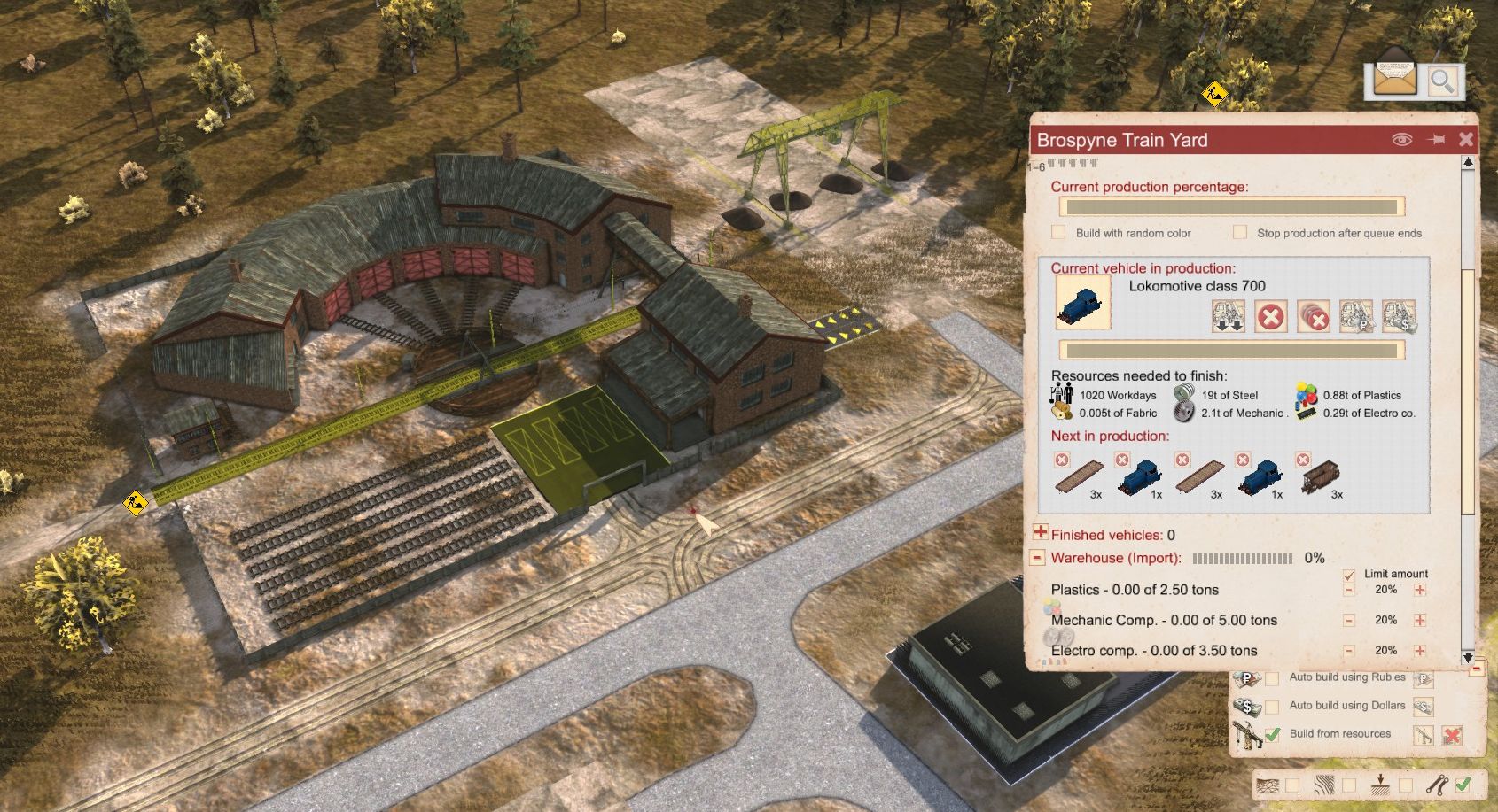 I’ve finished a railhead to the border, so small trains are importing bricks, boards and concrete panels, freeing up more lorries for construction.