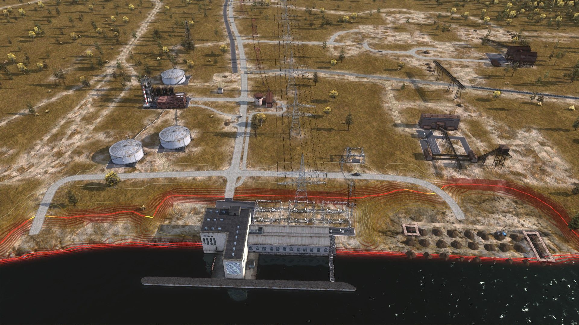 I forgot to turn the contour lines off for this screenshot. To the left are planned railway lines for oil transport, to the right bauxite mining is getting set up.