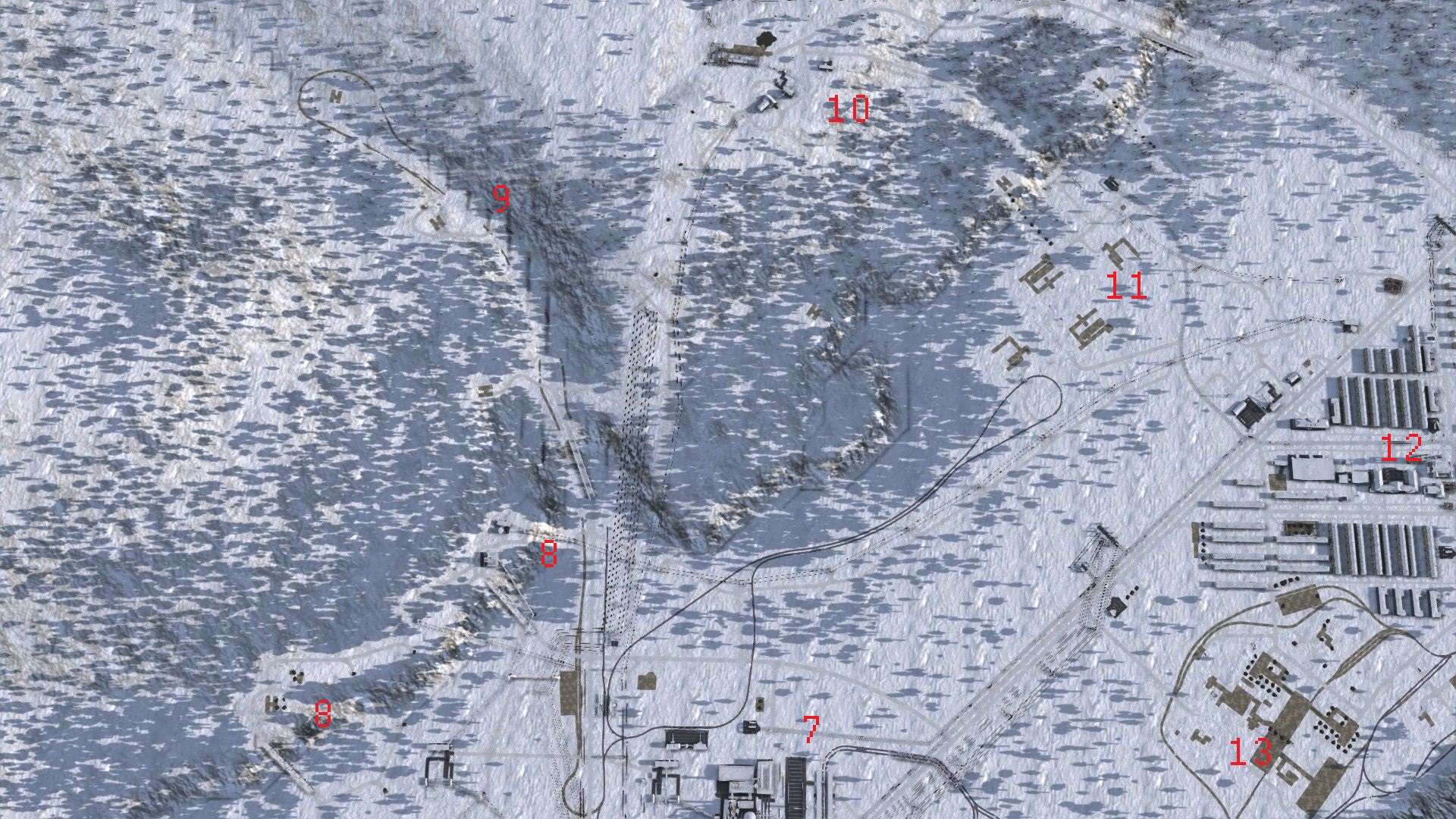 1. the town of Alexandrov; 2. small-scale oil refining and hydropower generation; 3. bauxite mining, processing and export (under construction); 4. the customs office through which I import goods by rail; 5. the main construction offices and materials storage/manufacture; 6. road and rail vehicle production complex; 7. steelworks and coal processing; 8. coal mines; 9. further planned coal mines in a loop up a shallow valley; 10. planned coal power generation fed and staffed via cable car; 11. planned iron mines and processing; 12. the city of Belogorsk; 13. planned brickworks, cement and panel factories; and 14. a planned mountaintop logging.