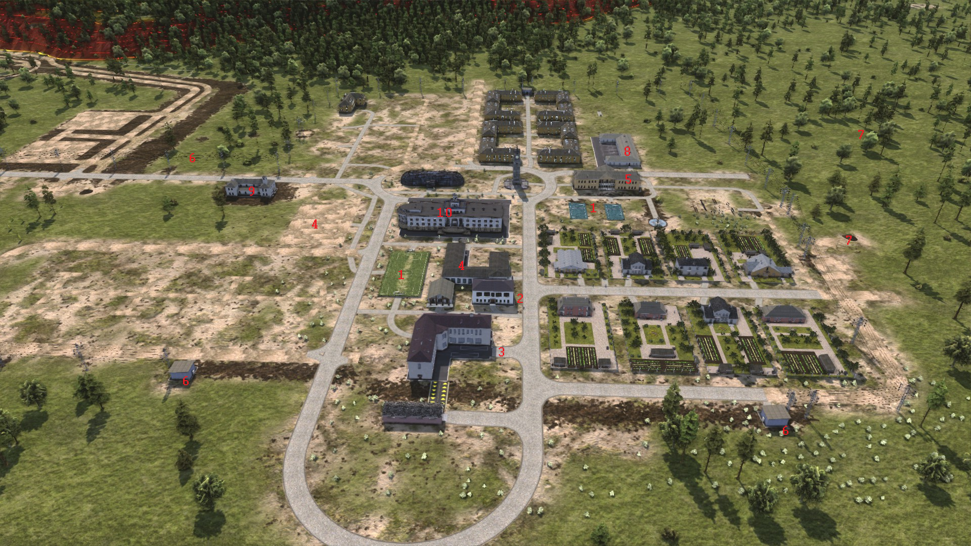 As well as the houses, there are lots of specialised buildings to meet all the needs of my citizens: sports (fields and gymnasiums [1]); culture (cinemas, libraries and theatres [2]); food and clothes (shops [3]); education (school [4] and university [5]. And also power [6], district heating, [7], a hospital [8] and a fire brigade [9].) A big bus station [10] will be used to pick up workers from all the houses.