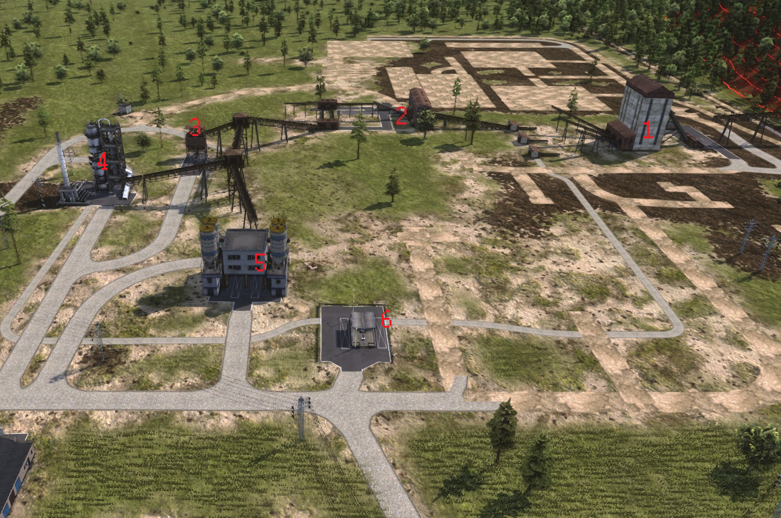 Feat: gravel quarry [offscreen], rock-crushing facility to process it [1], storage as a buffer [2] and an unloading dock to fill lorries quickly [3]). Conveyors feed this to buildings making cement [4] and asphalt [5], served by workers from a bus stop [6].