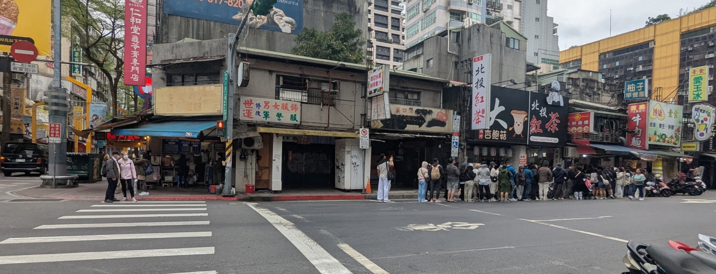 The morning brought two more Taiwanese food traditions: breakfast shops, and individual food joints becoming so trendy they get mile-long queues outside them. Guided by the excellent blog of Nick Kembel,* we headed to a street in Ximending featuring both, and went for an untrendy option. The old lady who runs it (initially grouchy, but warmed up to Fran’s attempted Chinese) gave us a laminated menu and a pen to order, and then pottered around an array of cooking and storage devices bursting out of her shopfront onto the pavement. I had a tuna, egg and sticky rice roll, Fran a bacon and egg roll, and we shared a pork floss (sort of powdered jerky) and scallion pancake along with soy-milk tea. We munched at a nearby bench near flags arguing for Taiwanese independence; Taipei is very clean and tidy, but it’s difficult finding bins. The main rail station (past a handsome old Japanese-era central post office) is an astonishing building, a colossal terracotta sweep of Chinese roof over a multi-layer warren of tracks and tunnels. After topping up our Easycards (Oyster, but for public transport and convenience shops for the entire country) we got the local commuter train to Ruifang, in the northeast of the island.