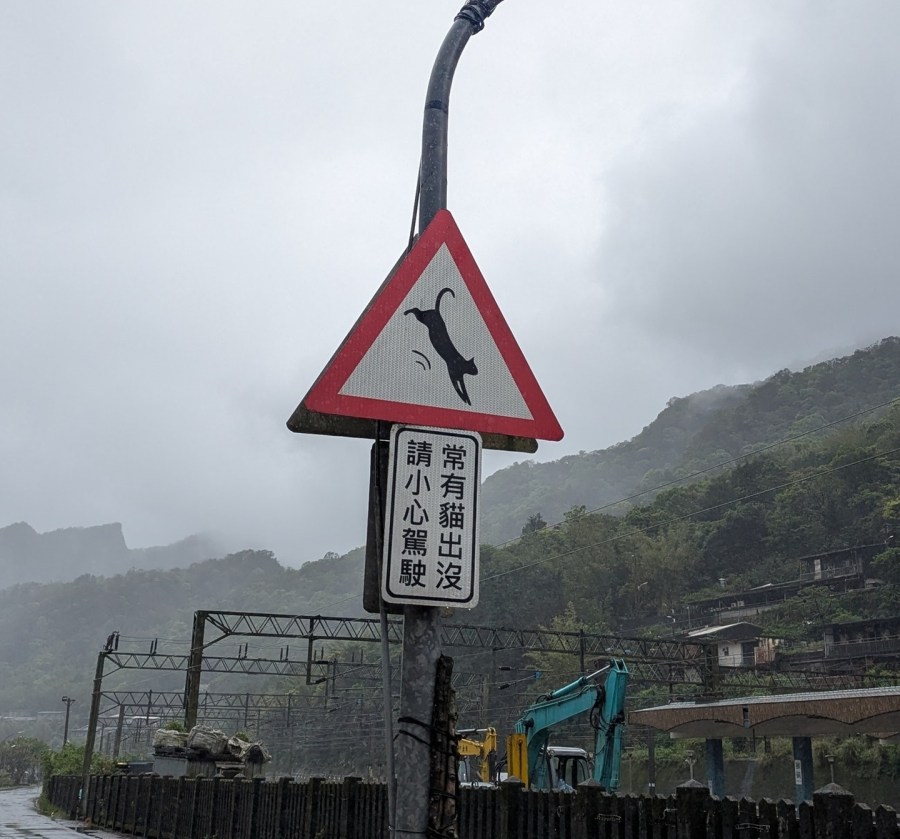 Back down the hill to a bus and one stop on the train to Houtong, whose twin attractions are a) abandoned coal mines and b) bonkers numbers of cats. One follows the other: in the late 2000s, faced with the decline of the industry and thus the town, some locals set up a sanctuary for abandoned cats which became a very popular attraction for day trippers from Taipei. The place now has cat-themed art everywhere, a narrow hillside street of cat cafes, several cat-related gift shops, a custom cat-friendly bridge crossing the railway lines and, of course, a fair number of cats.** It was raining fairly heavily at this point, so they were mostly sheltering. We greeted several cats, ate our cat-shaped cream puff and cat-decorated tiramisu, drank a mocha smoothie with a cream cat in it, and headed off.