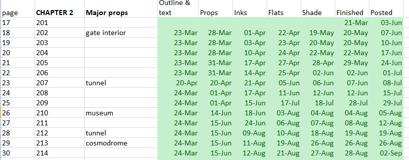 I have adjusted the ‘stages’ of design (this is what I’ve been using in the last few months) and while I still don’t have this nailed, I think an update schedule and drawing approach based around batches of a month’s worth of pages is currently feeling easier and more time-efficient.
