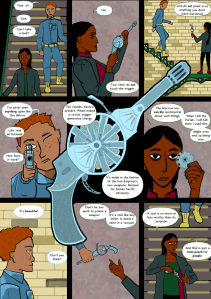 Obvious really, but a shocking amount of effort when you’re actually learning them all from scratch; you realise why the credits for most successful pre-internet comics had one person doing pencils, one inks, one letters, one colours… Writing is a skill; art is a skill (and drawing expressive people is a totally different skill to drawing plausible mechanisms or cityscapes); visualising a scene and segmenting it into panel layouts is a skill; inventing and applying colour palettes is a skill. All of these I’m essentially teaching myself from a baseline of zero (except writing fiction, from a baseline of ‘I worked hard at this ten years ago’).