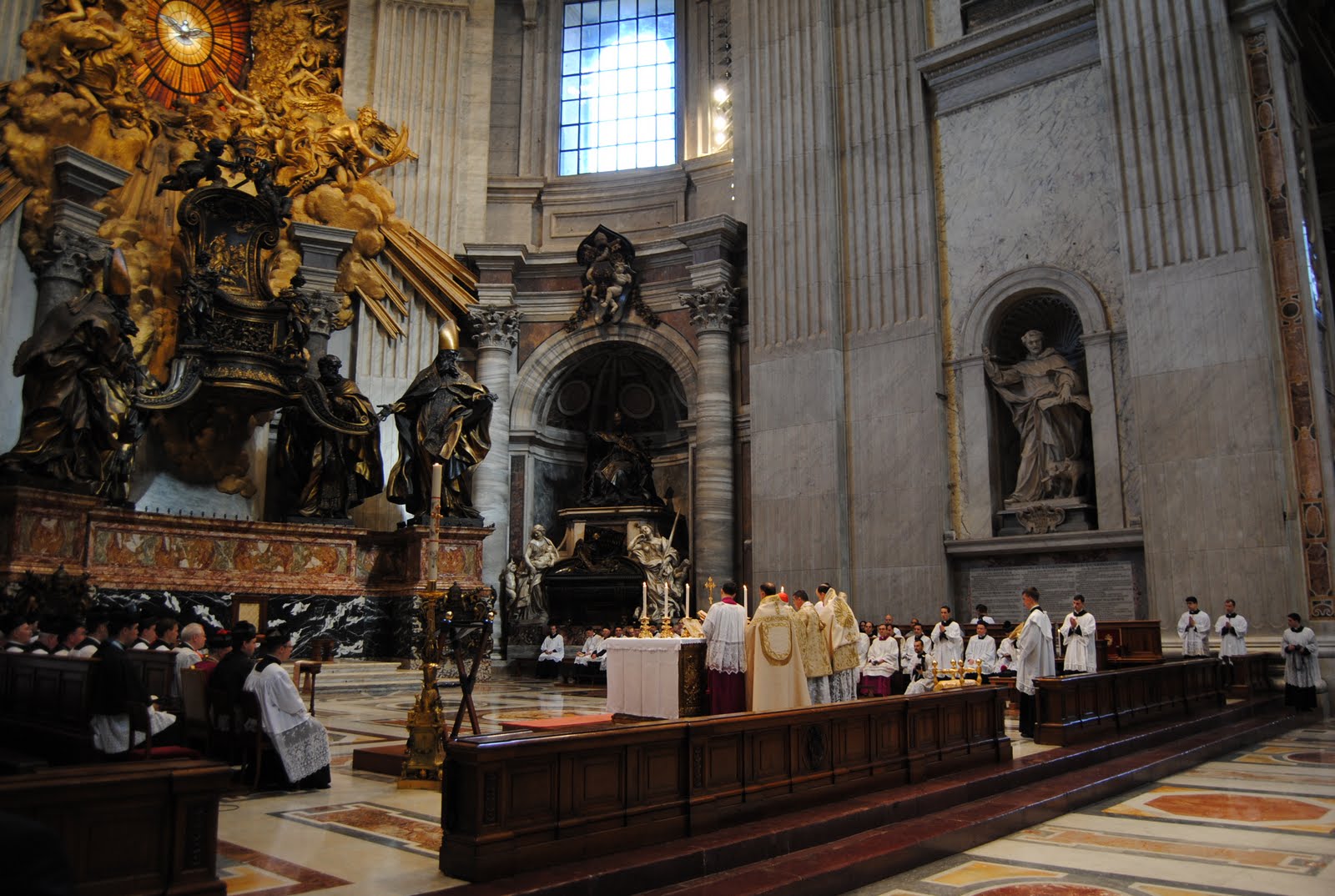 It’s not boring, but the most interesting parts were the flourishes of proper Baroque weirdness: the brass skeleton of Time and/or Death suffocated by a blanket of red stone at one pope’s reliquary; the insane curly-wurly bronze columns supporting the centrepiece canopy; the magnificent, unnerving Chair of St Peter, a glaring golden window which bursts into waves of gilt sculptuary that spill out over the columns around them, throwing gleaming clouds and sunbeams crawling with angelic hosts to support a giant floating chair marvelled at by four gigantic bronze saints. (My pictures didn’t come out well, so here’s a better one. For scale, please note that the blokes at the bottom are around seven metres high.) Also rather original are the grottos full of dead popes underneath – a curious leftover-feeling space – and the Swiss Guards, a few in the tasteful but still very 17th-century blue uniforms, many in the eye-wrenchingly garish puffed-and-slashed tricolour ones, like Romanian flags put through a shredder.