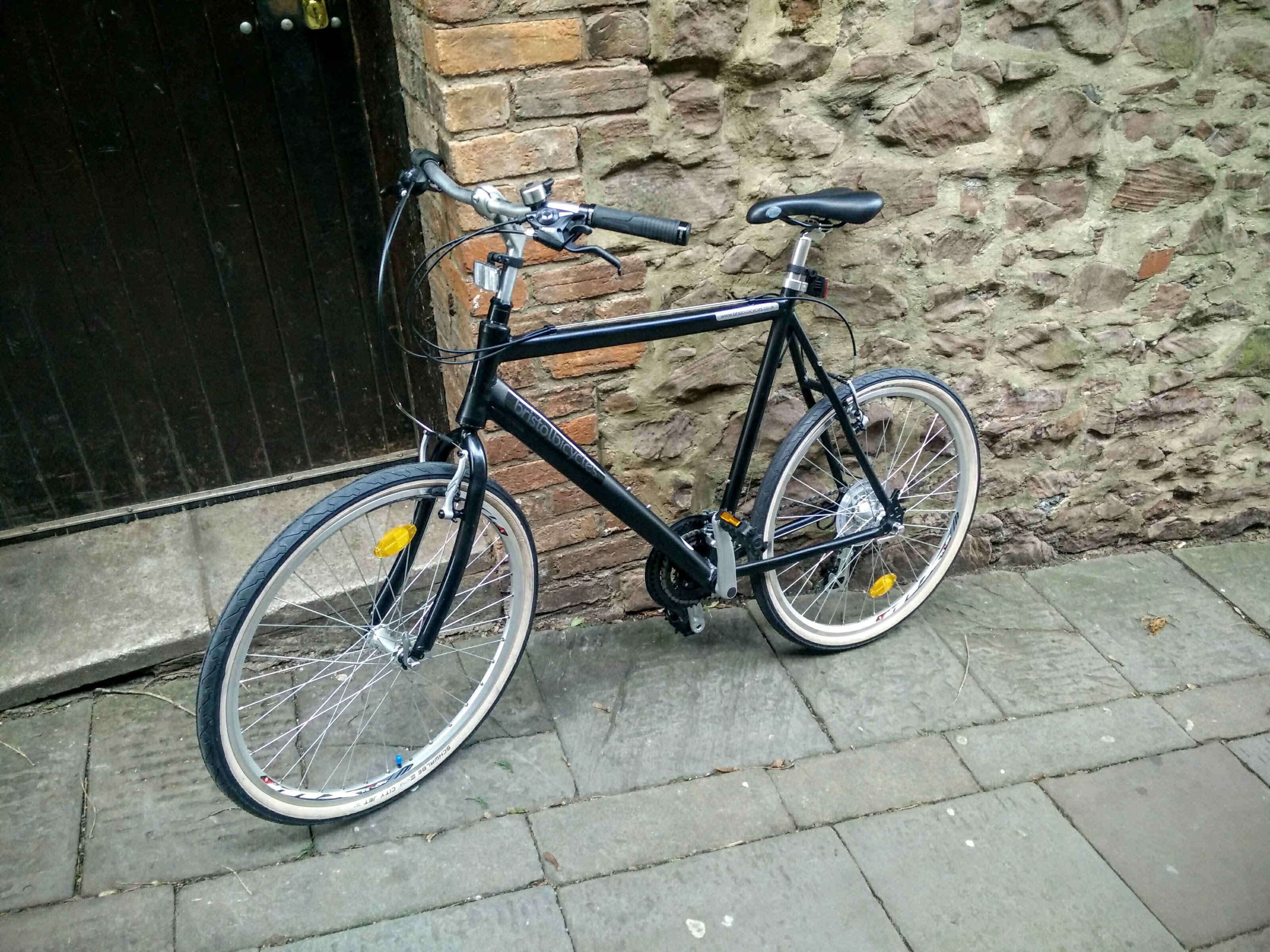 At the start of second year, I was given a nearly-new second hand bike by my wonderful un-godparents, which served very well for nipping around campus and taking me to various hellish corners of Birmingham for my census work. It was my mainstay for a long time, the first machine I as an adult felt any ownership of, with aftermarket aluminium pedals I fitted when the plastic ones fell apart, and a little green zip-tie round the headtube identifying my right to lock it to things around Mason Halls. But it was quite heavy, and was never really the same after Dad jammed it into the back of the car when shipping out for third year: the derailleurs clicked in spite of endless fiddling with the levers and cables, and the brakes seemed to be useless despite one replacement after another. But it served well (if decreasingly frequently) over the next couple of years, until I locked it up in the city centre when going off to Ukraine, and came back to find it missing.