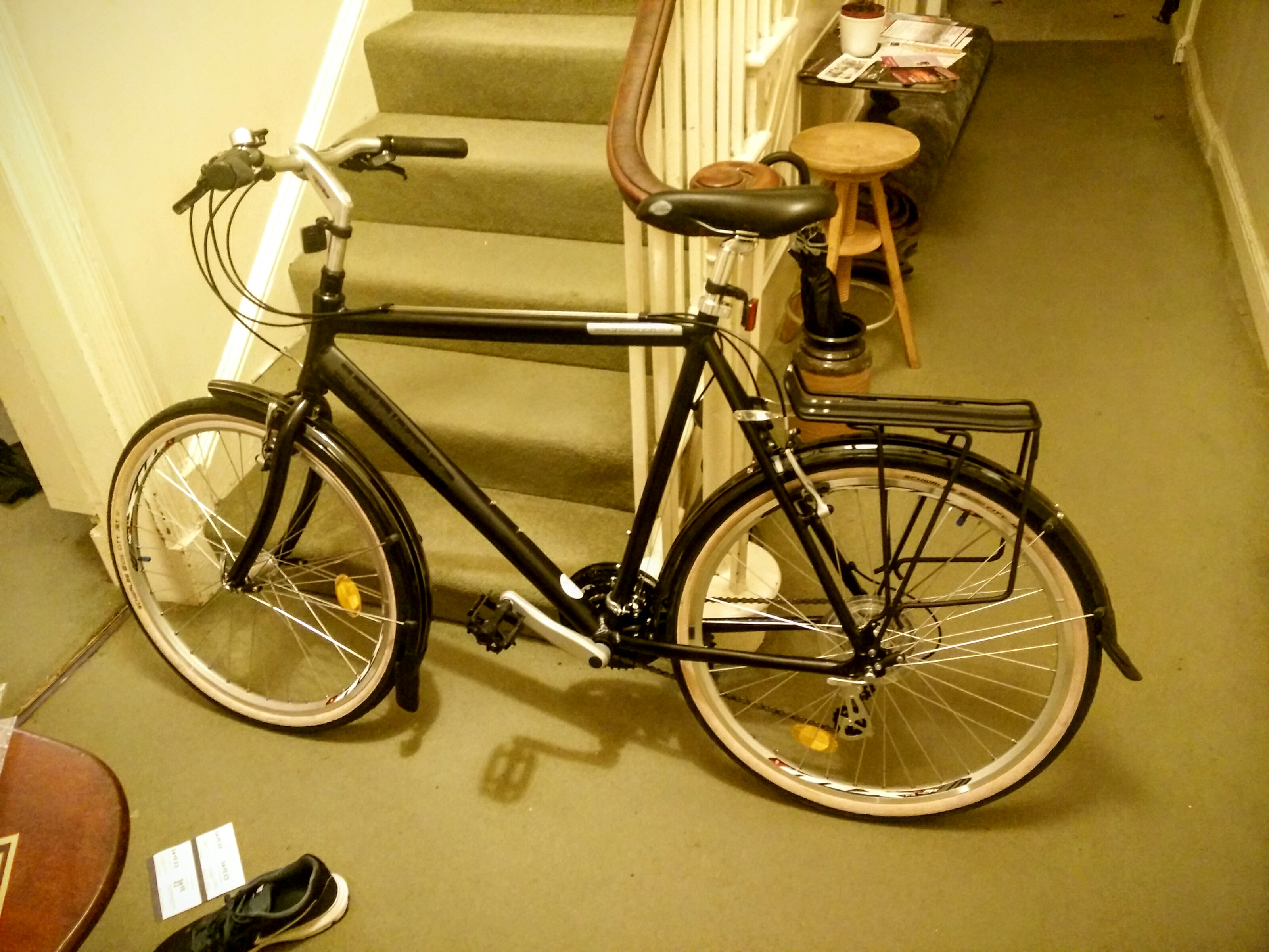 It’s a “Park Street”, crisp black and silver,* with smaller wheels than I’m used to but excellent gears and a light, compact aluminium frame; the brakes are superb, the posture natural. I was struck on my first ride how odd it felt to have a bike all tuned up and silent, with no clicking or rattling anywhere, no stick in the controls or idiosyncrasies in the gear levers. It felt… nice. I don’t actually need it for my current trip to work – which is fairly hilly and takes exactly half an hour, my cutoff point for where the extra faff of cycling (especially needing extra clothes and kit, which you really do with these cold dark winter afternoons) outweighs the travel time saved. But it’s very nice to have, for the future, a machine which absolutely fits my spec and feels right, one which is, for the first time, something just for me.