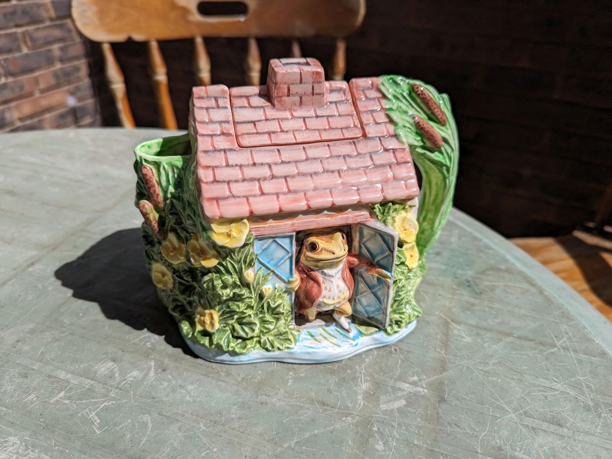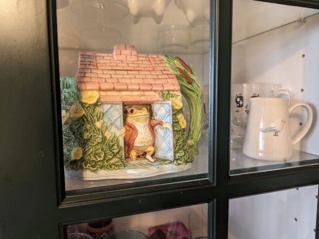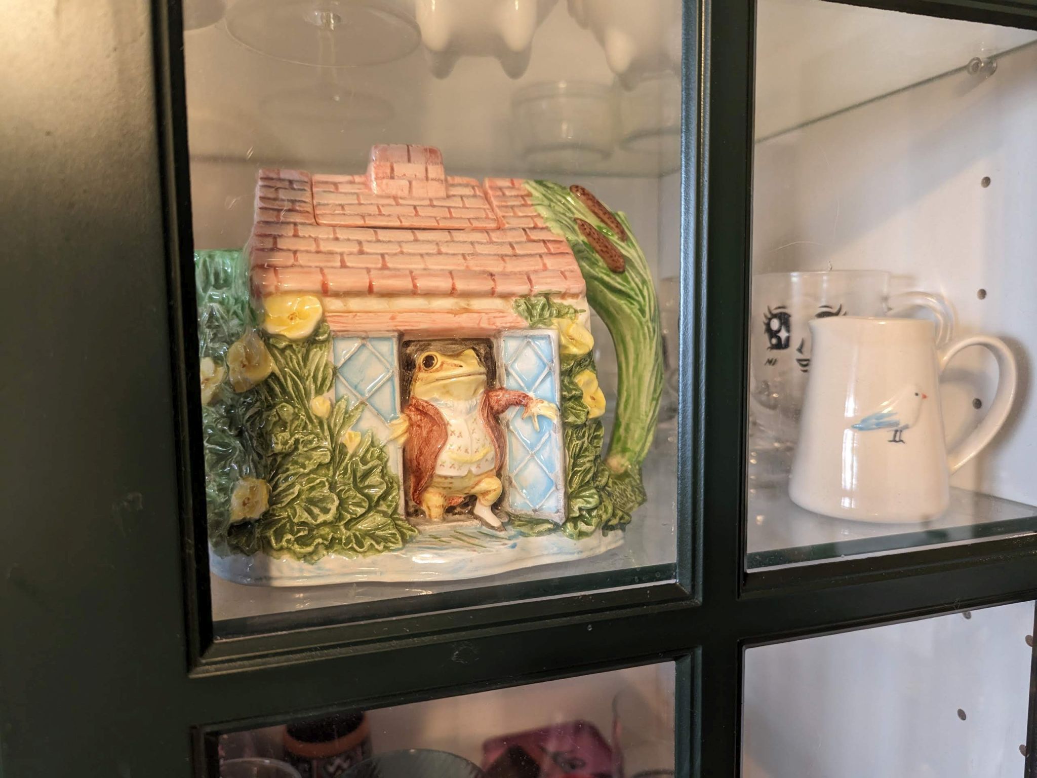 I immediately tried it out as a teapot, but that didn’t work well (the handle is hollow and the porcelain very thin so it gets uncomfortably hot): this is a frog built for form rather than function. However, he’s an absolute delight to have in the kitchen, and each morning I am greeted by Jeremy Fisher stepping out happily into the new day.