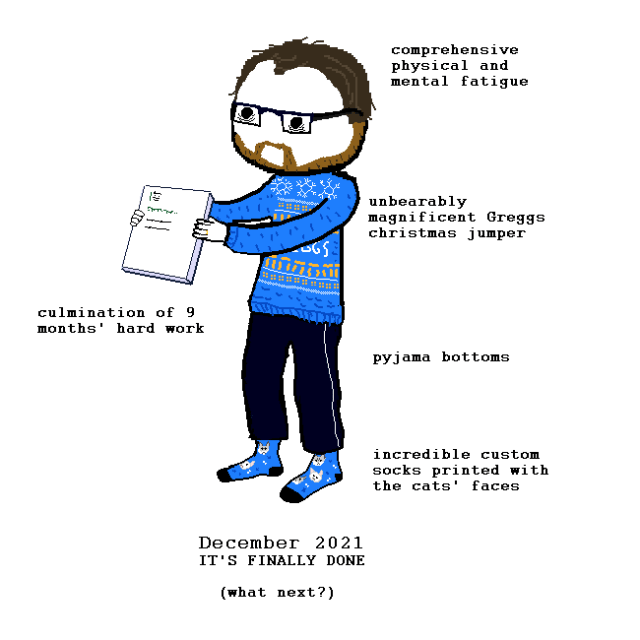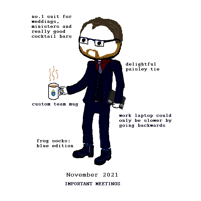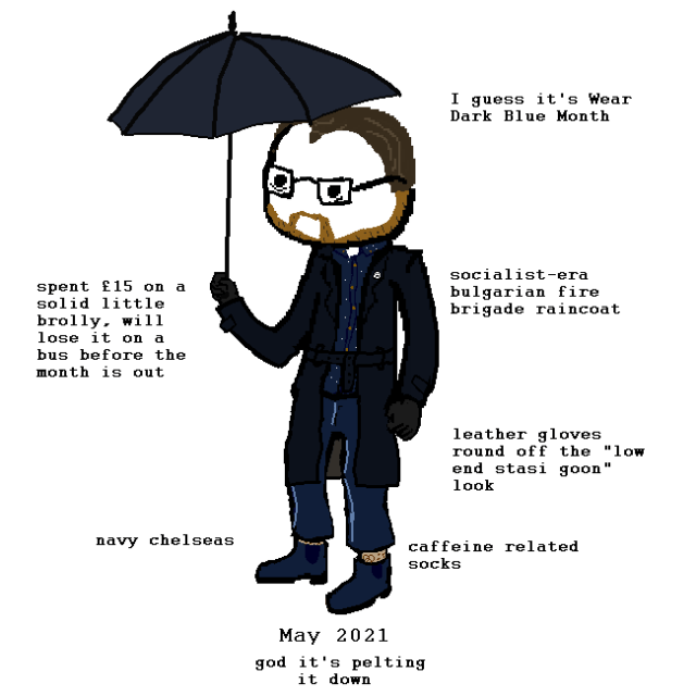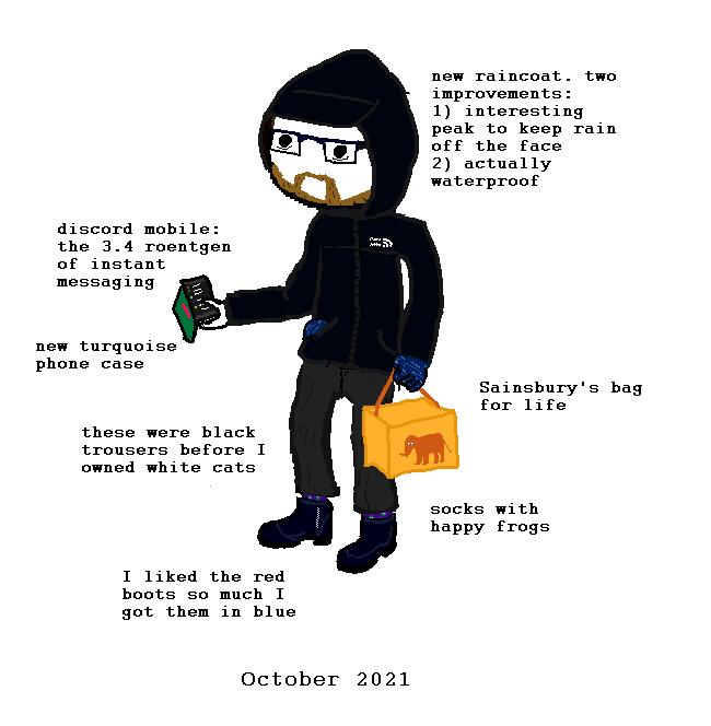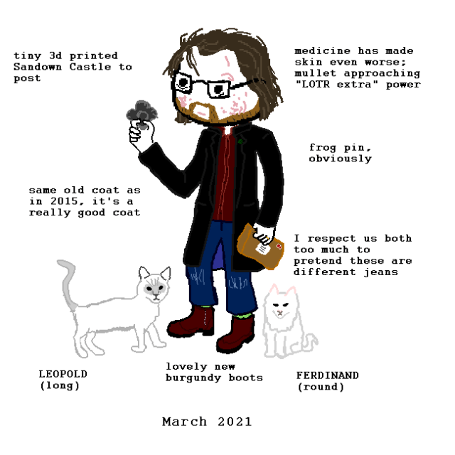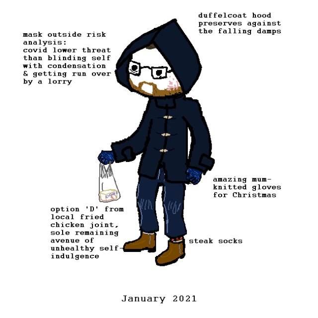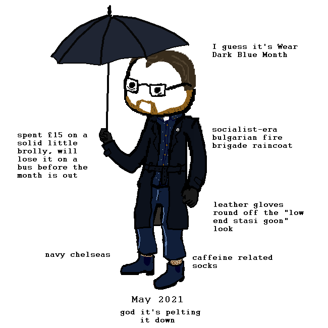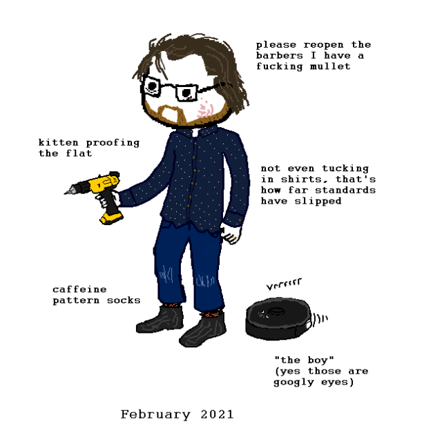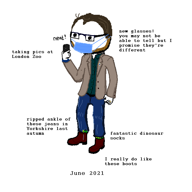 Last year I resolved to do more CREATIVE THINGS (construed quite broadly), and part of that was producing a little self-portrait every month. I’ve been doing these every few months for years and years now (the original template was from 4chan back in the late 2000s), but this was the first time I did them regularly. As with most things about me, it’s partly narcissism but mostly laying the foundations of future nostalgia, so another me one day can look back at what I wore and and cared about in the pandemic years, without having to struggle with the useless memory we share.
